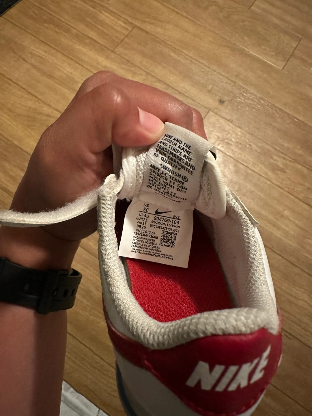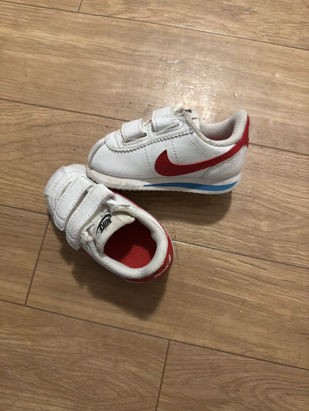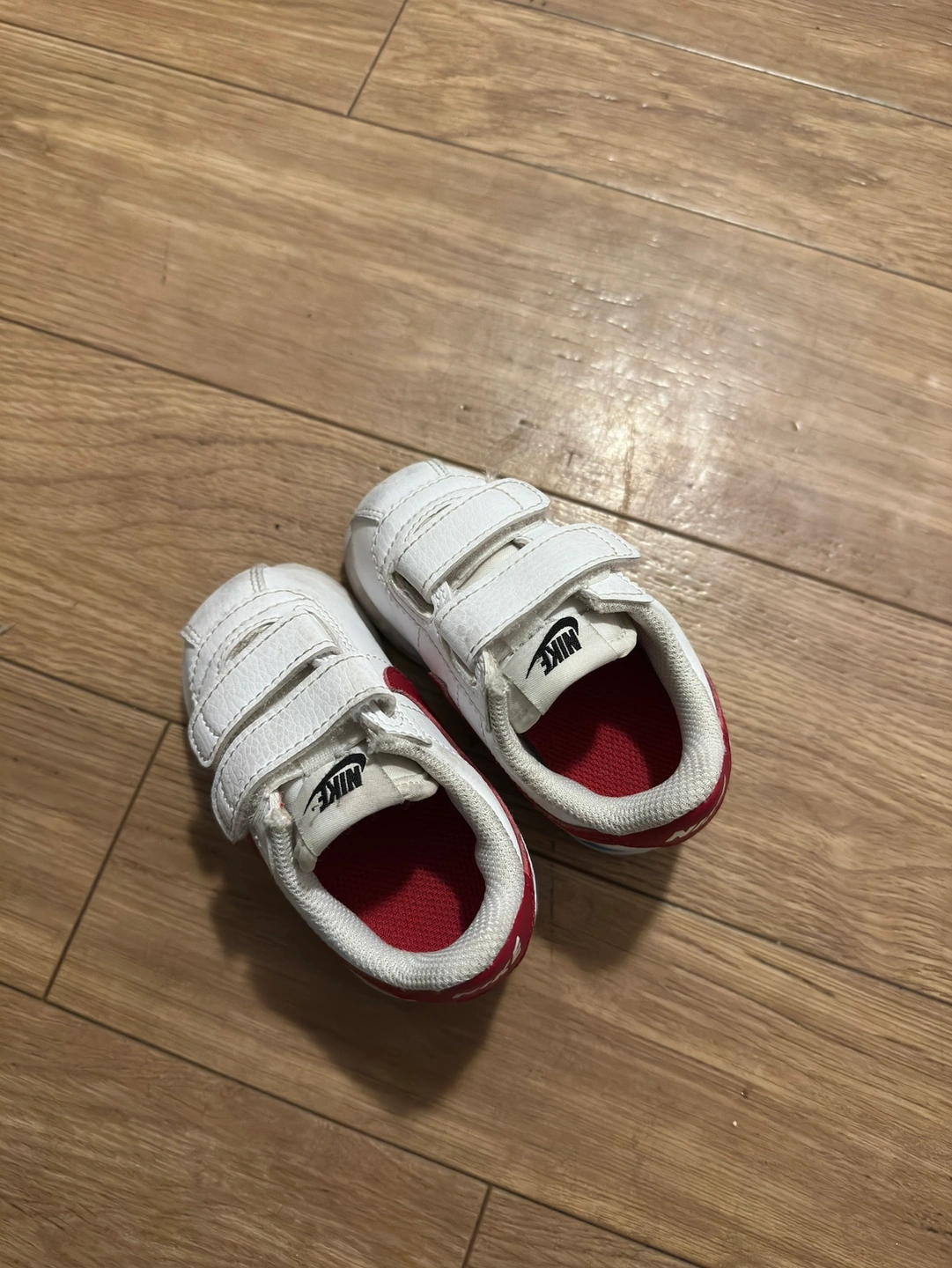 White leather baby shoes with red accents. Size US 5C. Features a velcro strap closure. Great for infants and toddlers.