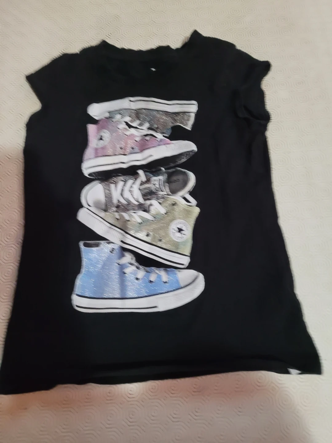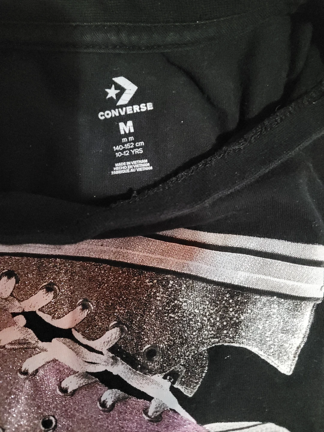Black Converse t-shirt with a graphic of stacked glittery Converse shoes. Size medium, fits 140-152 cm or 10-12 years. Made in Vietnam.