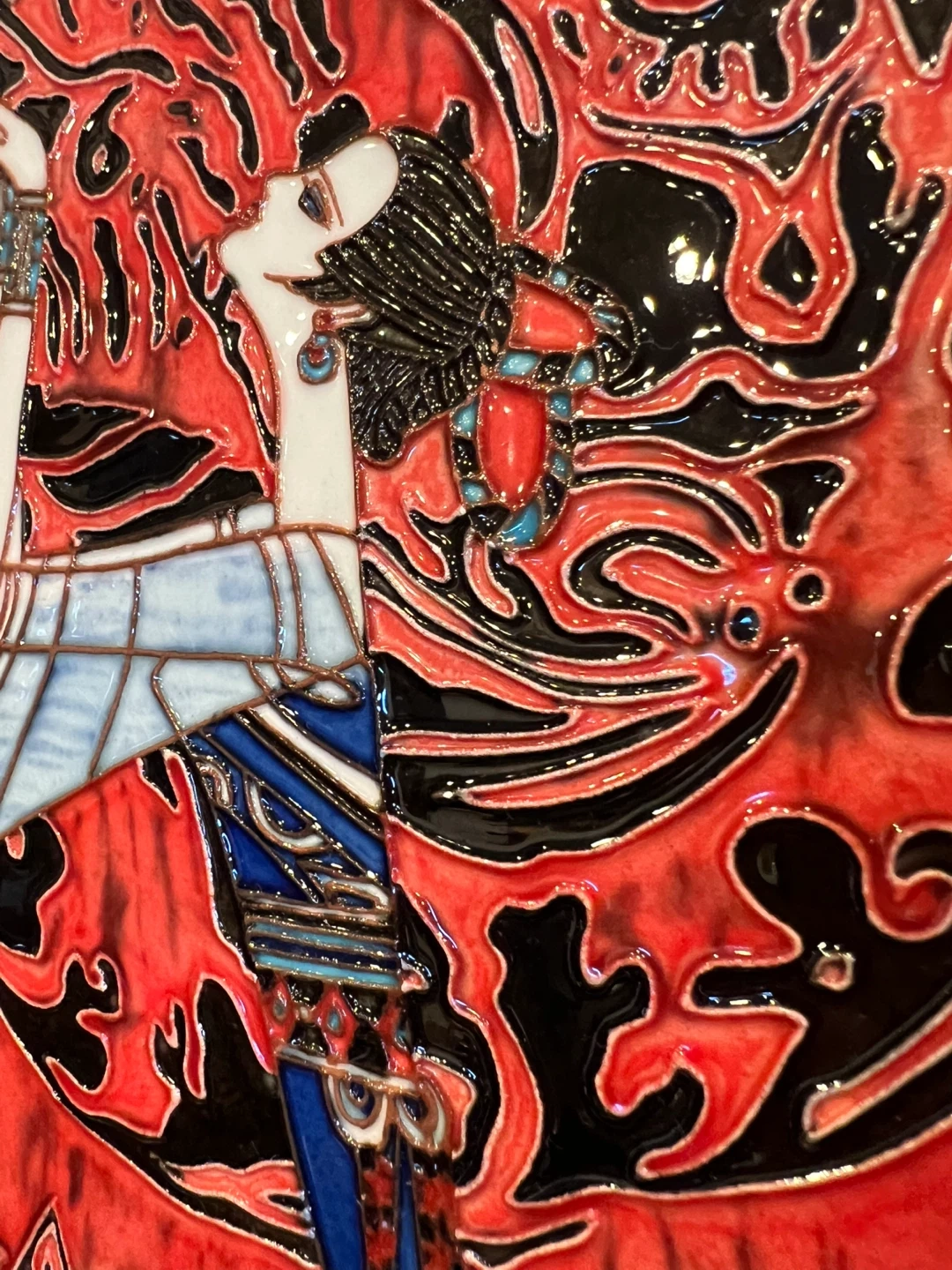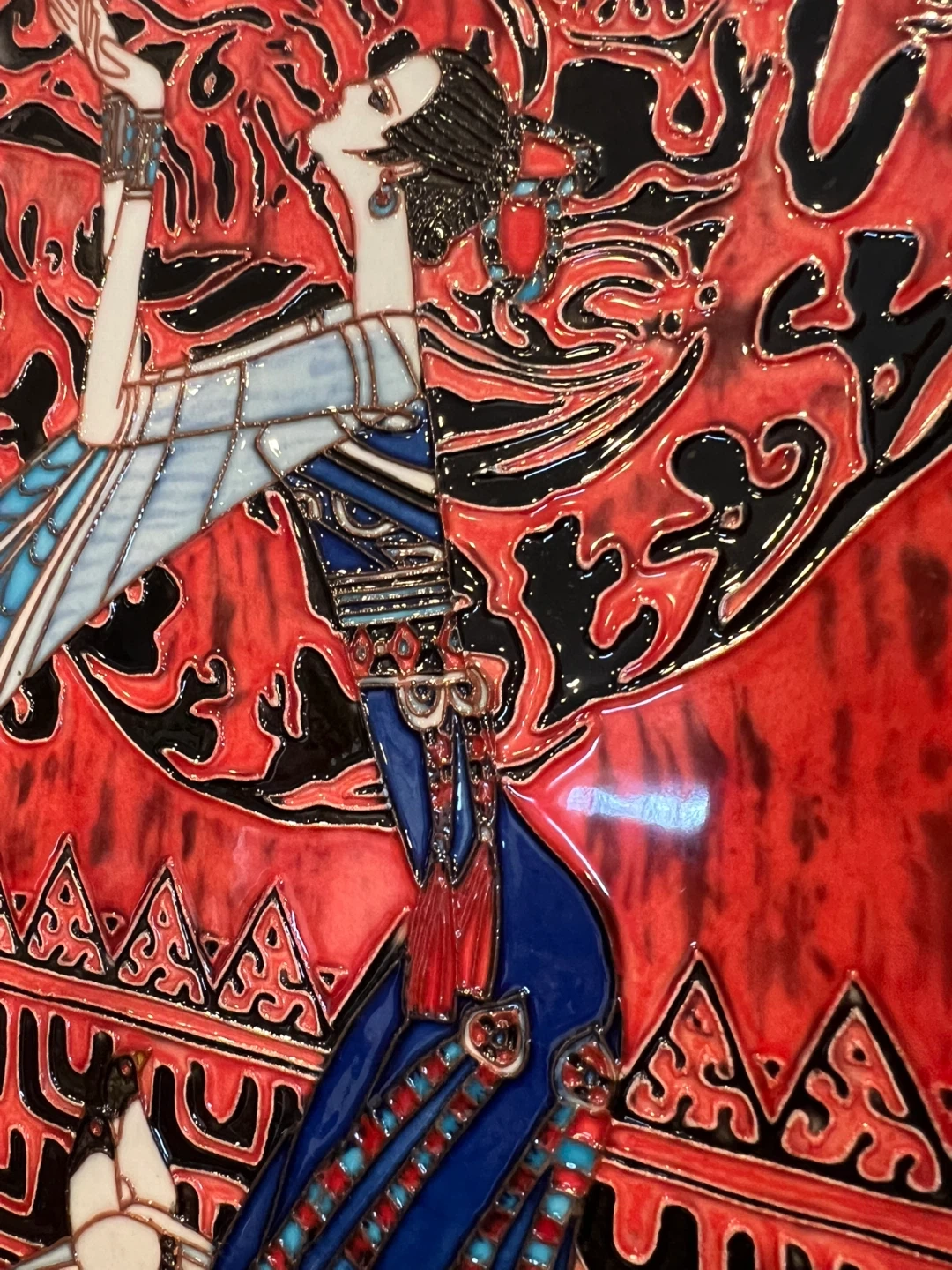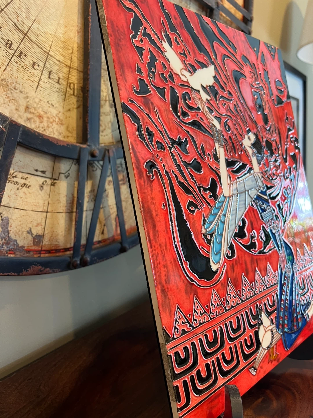 The piece features a stylized figure reaching upward toward a white bird (a dove), symbolizing goals of equality, development, and peace
