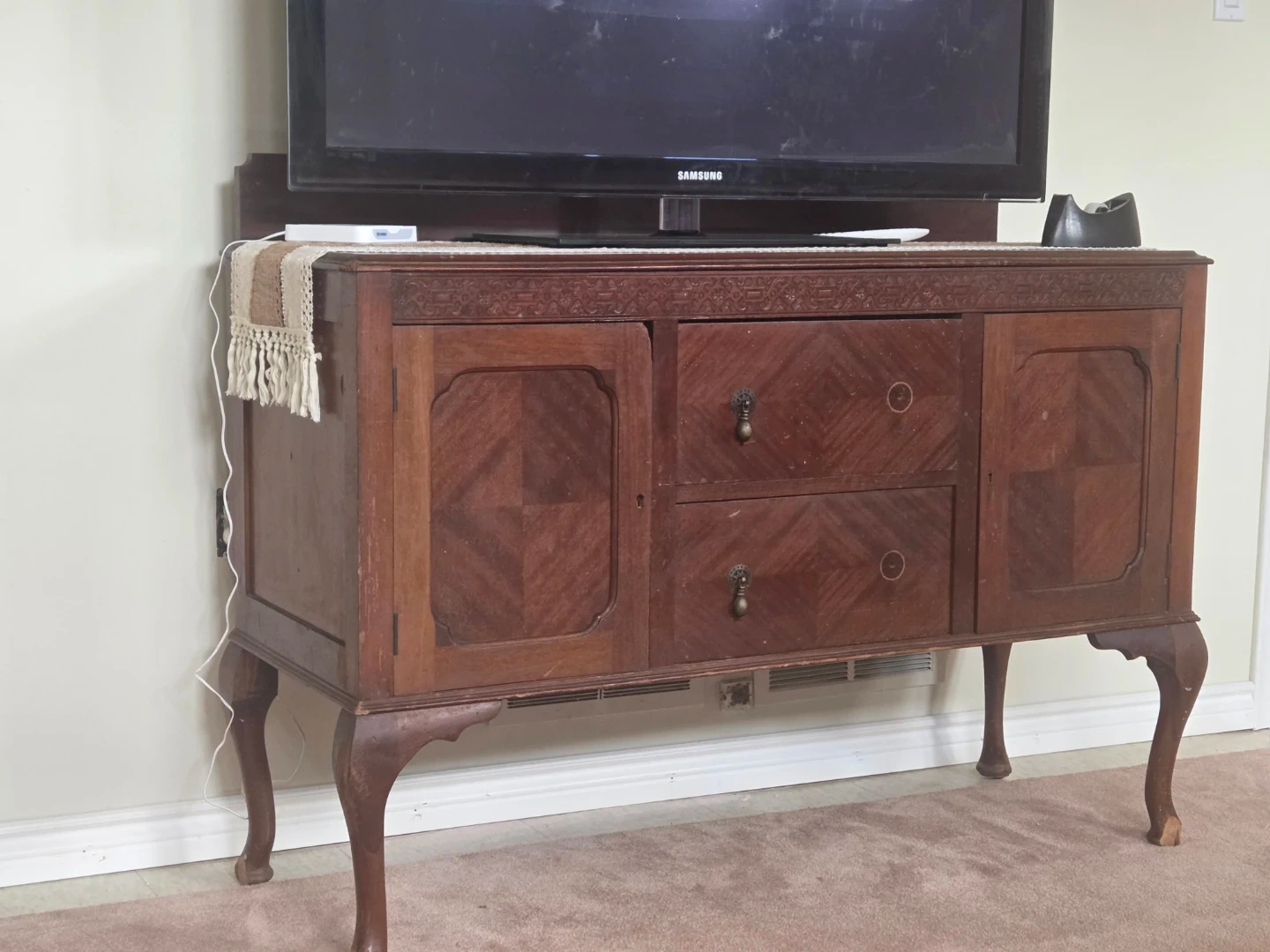 This vintage wooden sideboard features two doors and two drawers for storage. It has ornate detailing and claw feet. It's a lovely piece for any dining room or living space. Feet are damaged