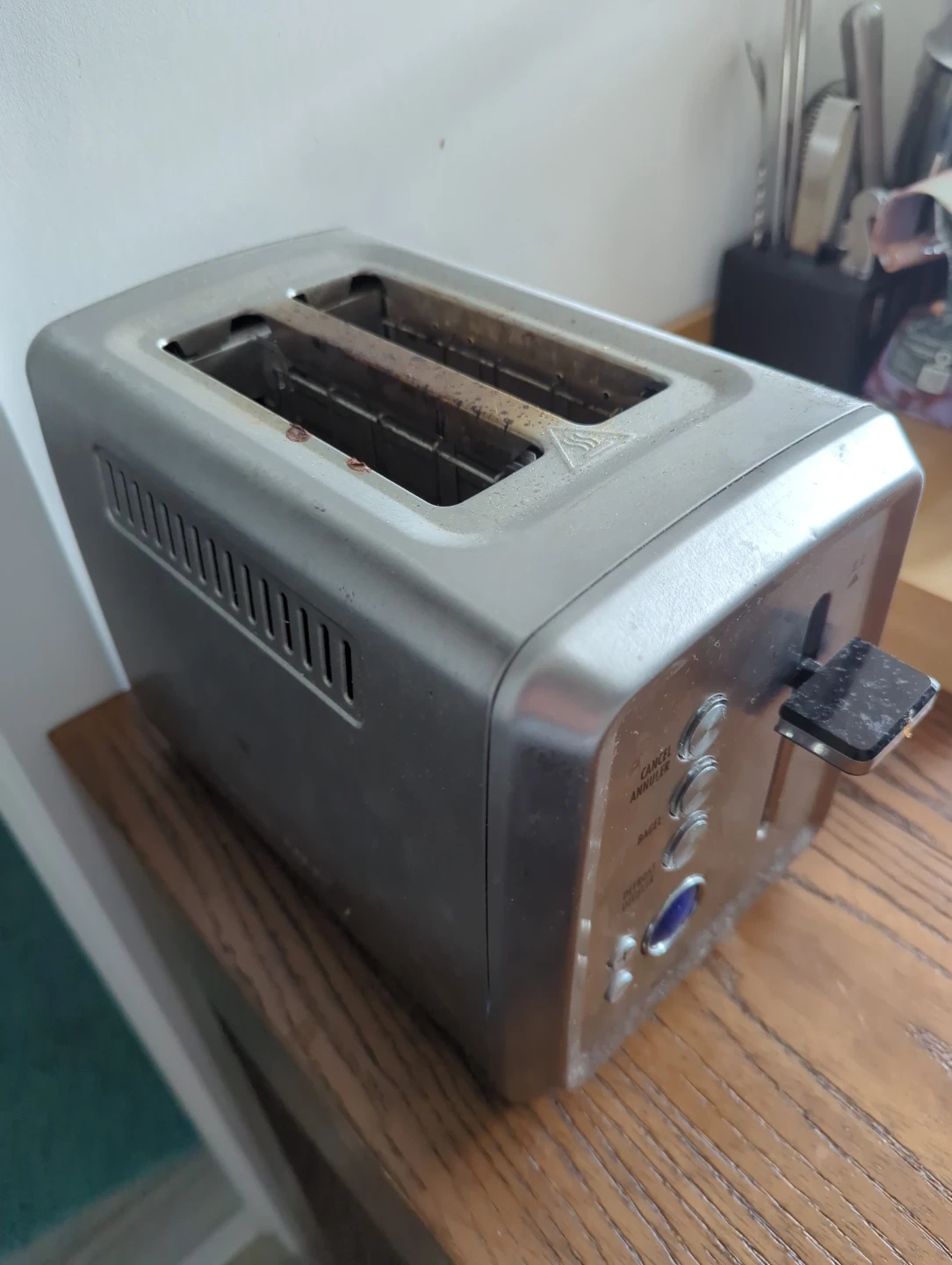 A silver 2-slice toaster. It features settings for cancel, bagel, and defrost. Perfect for making toast and bagels for breakfast!