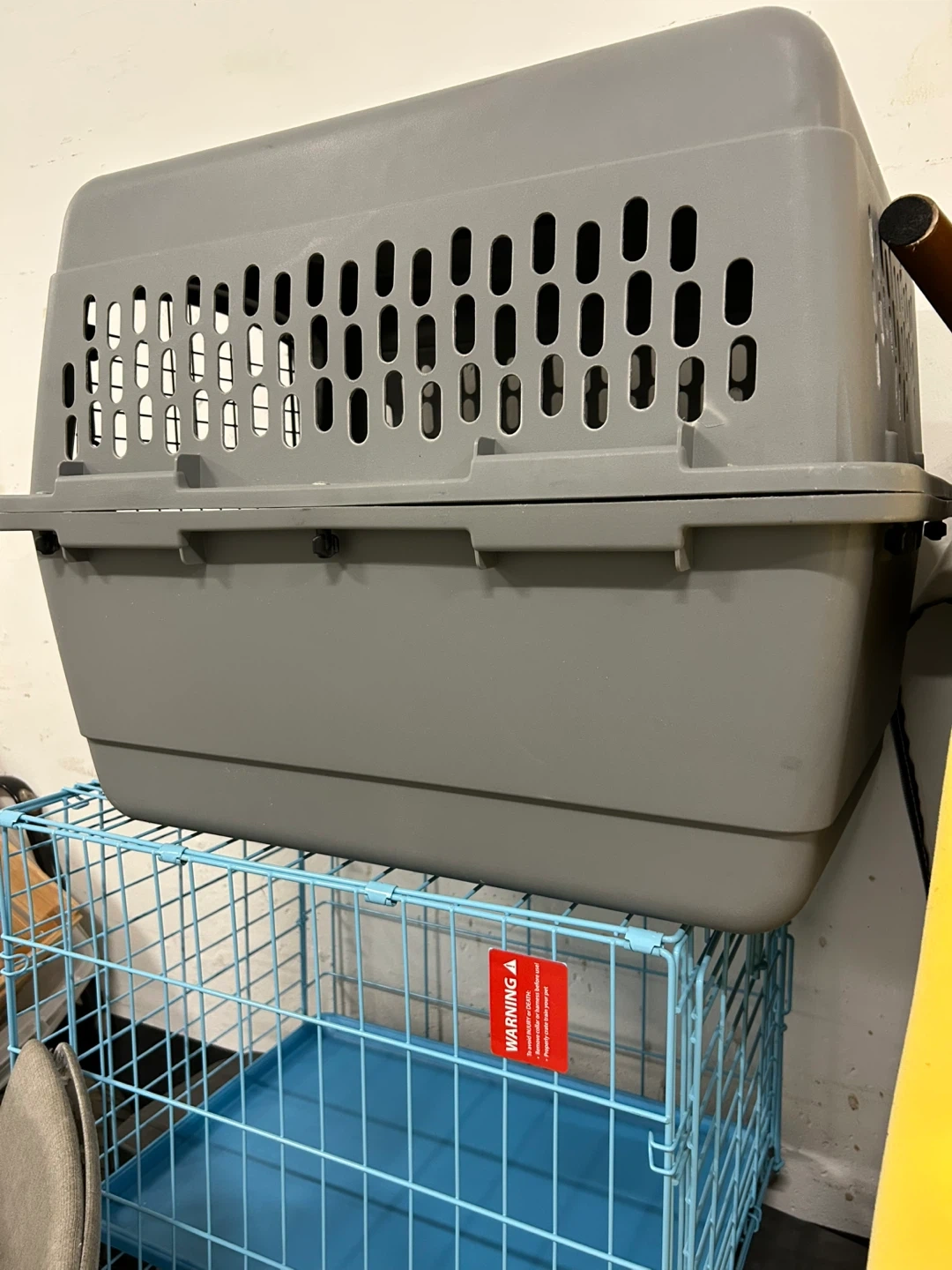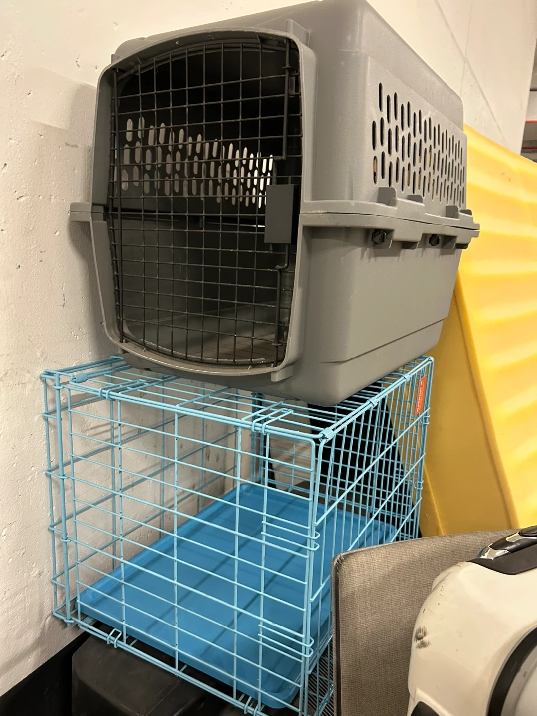 Selling a pet carrier and cage combo! The carrier is grey and the cage is blue. Perfect for your furry friend!