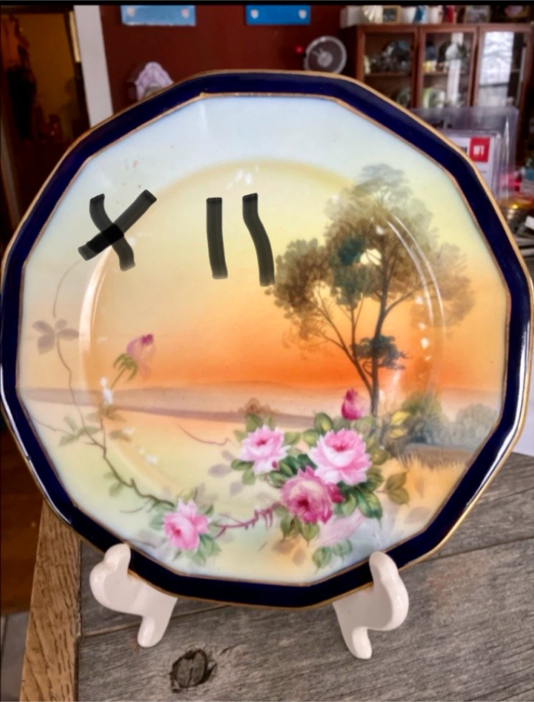11 Beautiful hand-painted Nippon porcelain plate 8” with roses, a tree and a sunset scene. It has a dark blue rim with gold trim.