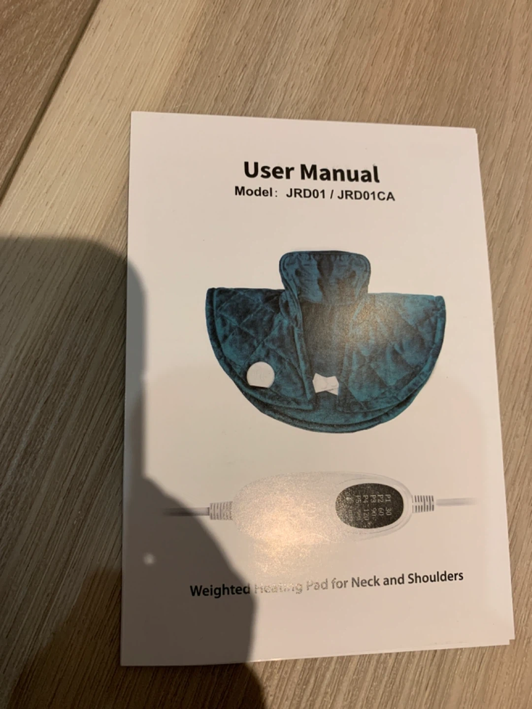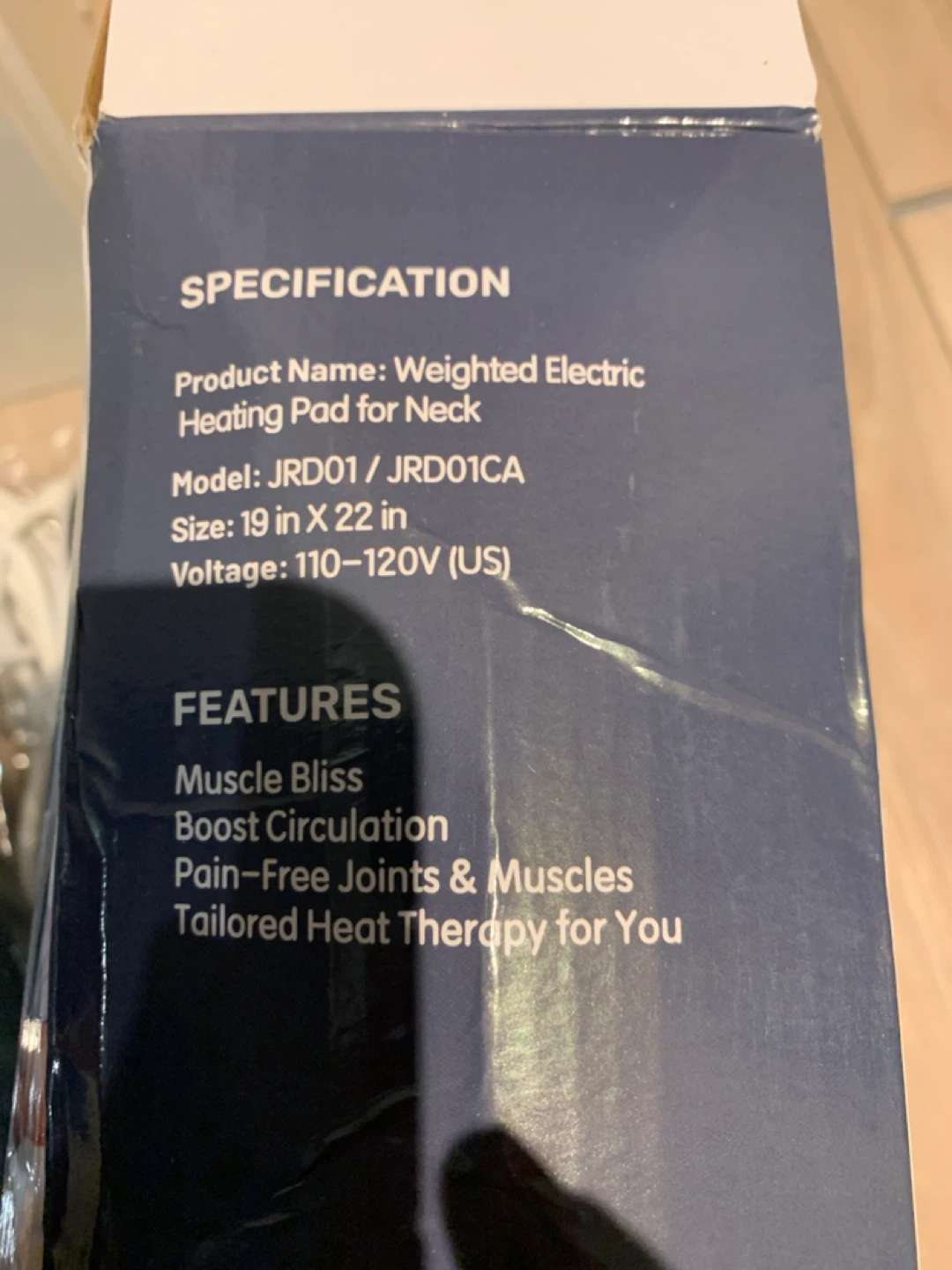 This weighted electric heating pad is designed for neck and shoulders. It measures 19 in X 22 in. It comes with a controller for heat settings. Great for soothing muscle aches!