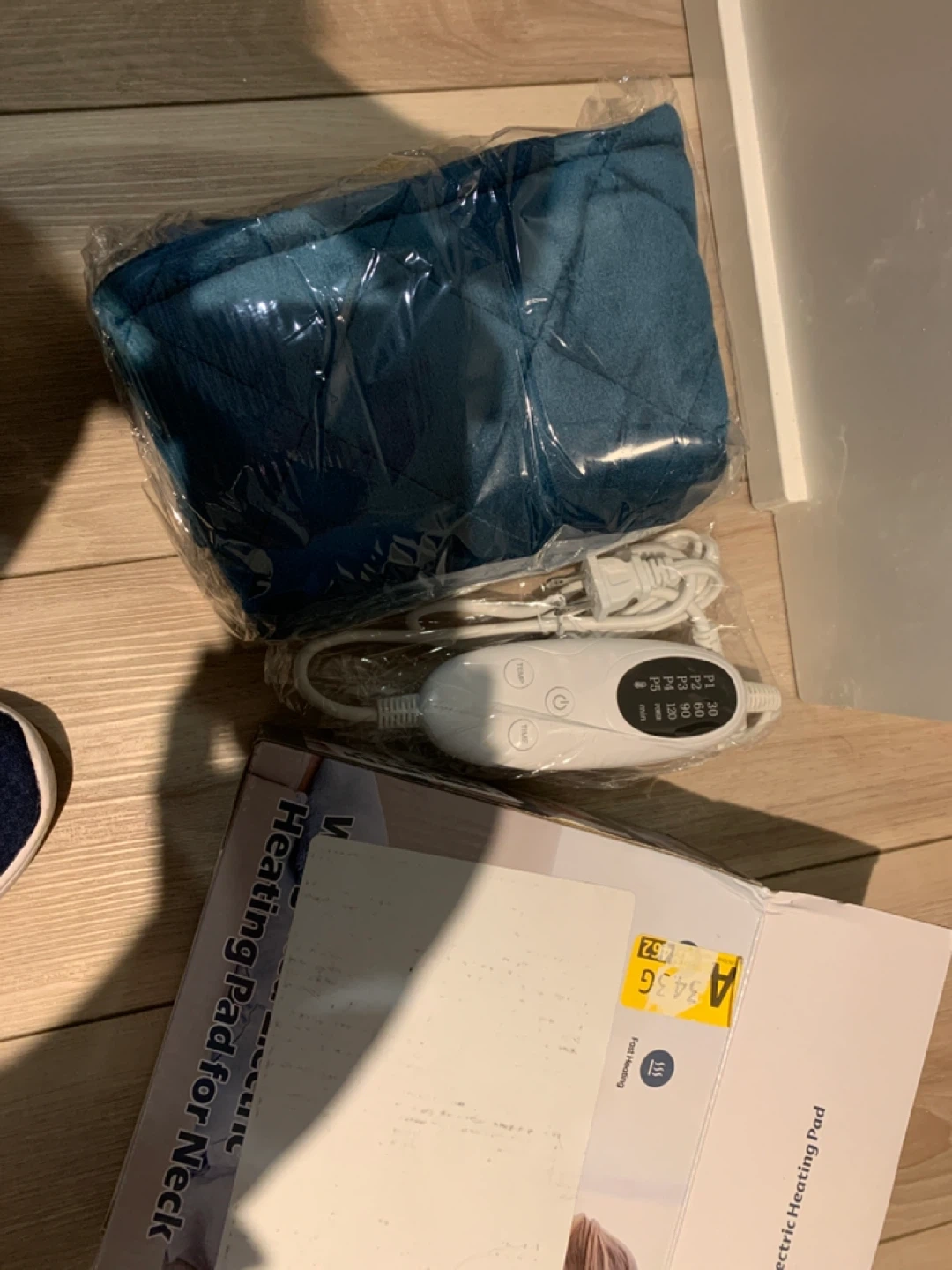 This weighted electric heating pad is designed for neck and shoulders. It measures 19 in X 22 in. It comes with a controller for heat settings. Great for soothing muscle aches!