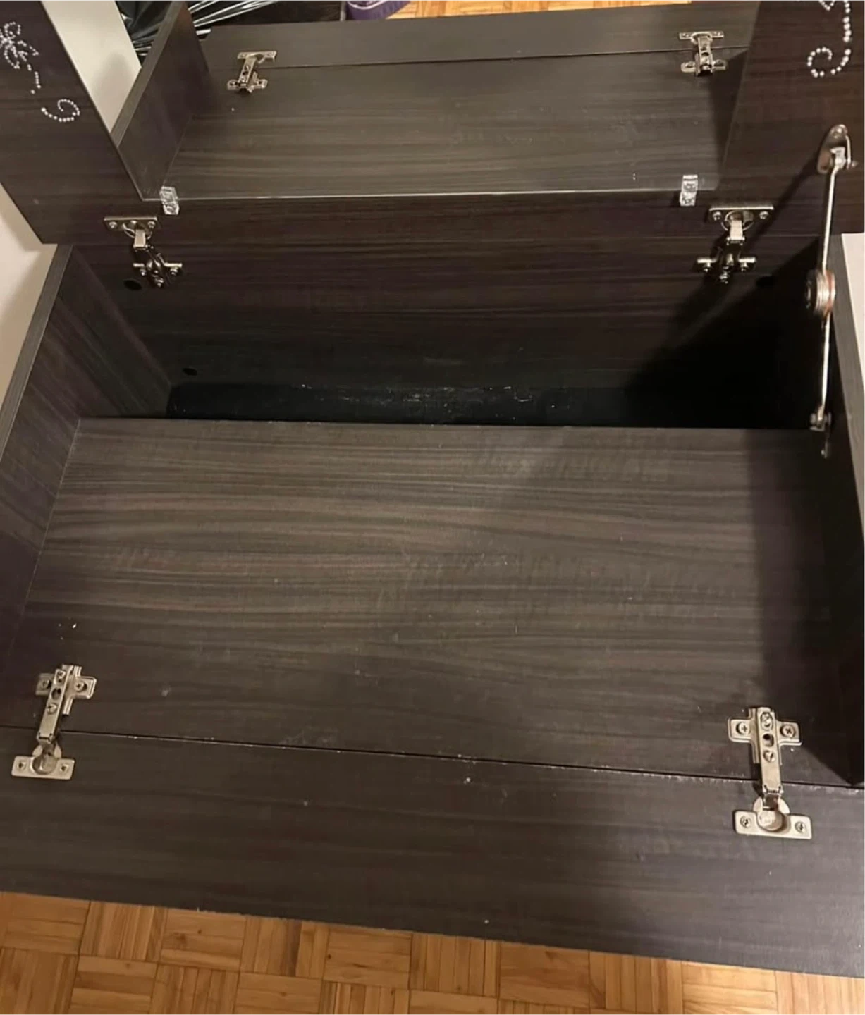 Dark wood vanity desk featuring a flip-top mirror and ample storage space inside. It's made of wood composite material. This desk is great for a bedroom or dressing area.