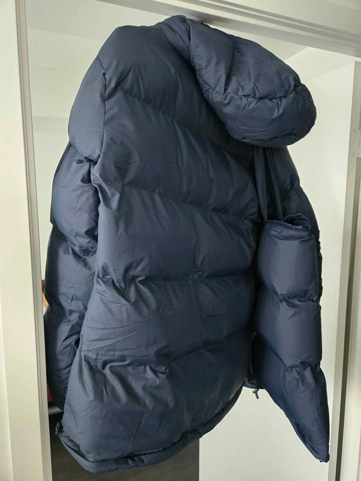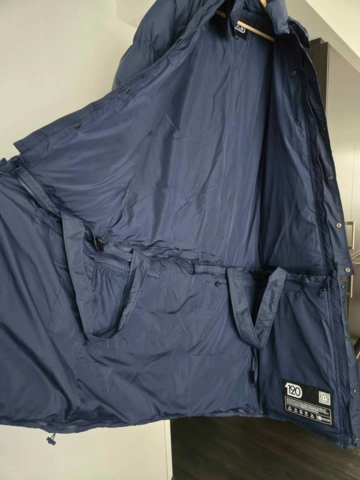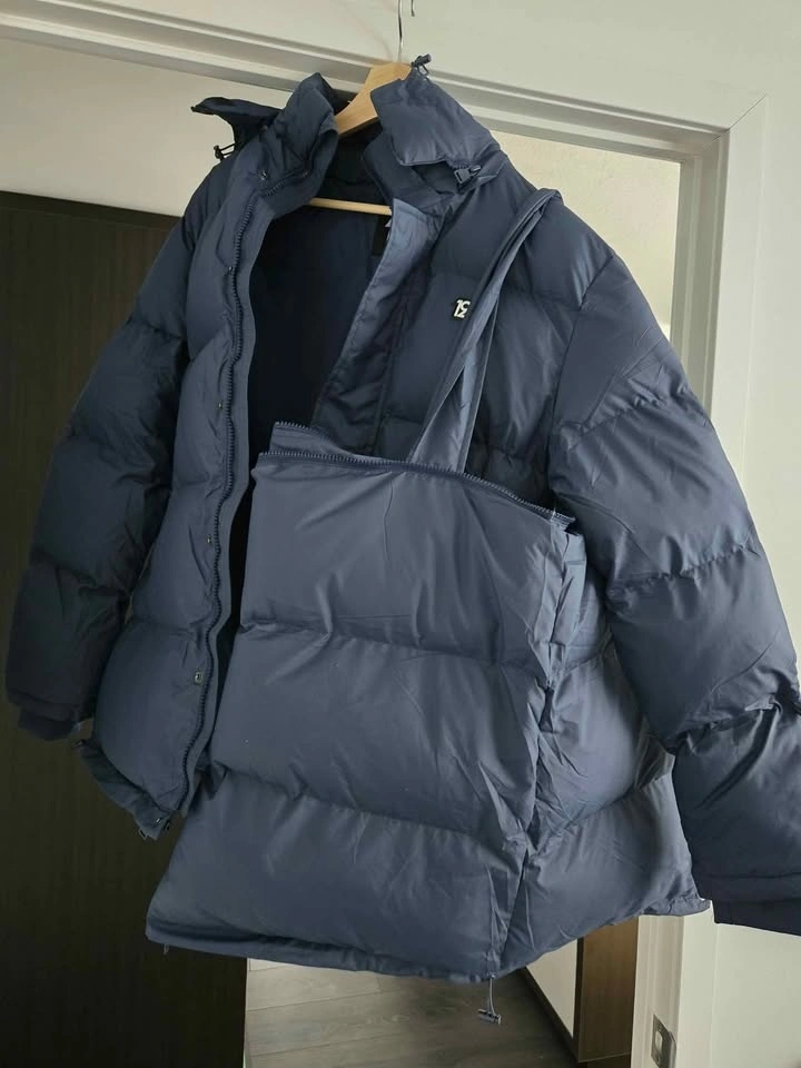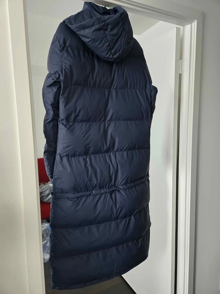 Size large. Loose fitting for regular medium wearers or true large fit. Very unique coat that can be worn as a mid length or long coat. The bottom detaches into a bag or pillow. Need a shopping bag from unexpected shopping or traveling? Just detach the bottom of the coat for a nice large bag. Extremely convenient and warm. Actually too warm for me since I drive. If the posting is up, it's available.