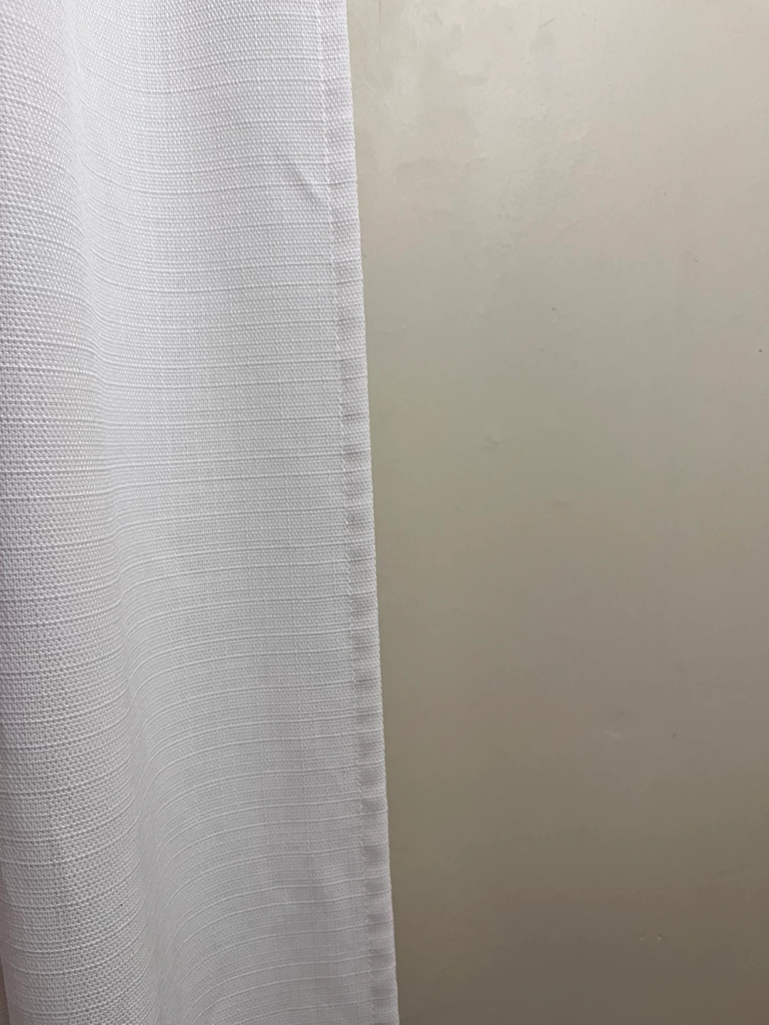Selling a set of FOUR white fabric curtains in very good condition. They were well taken care of. They’re the pocket rod type, no eyelets or hooks, not blackout. The fabric is a beautiful minimal woven style. First picture is with the indoor light on, second with it off so you can see tone change in different lighting.