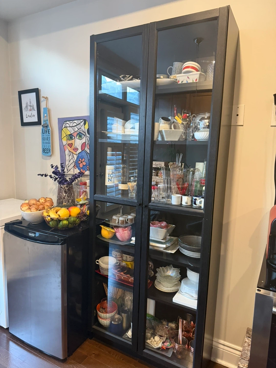 This is a black-brown IKEA Milsbo glass door cabinet. It's great for displaying your dishware and collectibles. The cabinet features glass doors to keep dust out. It is I perfect condition