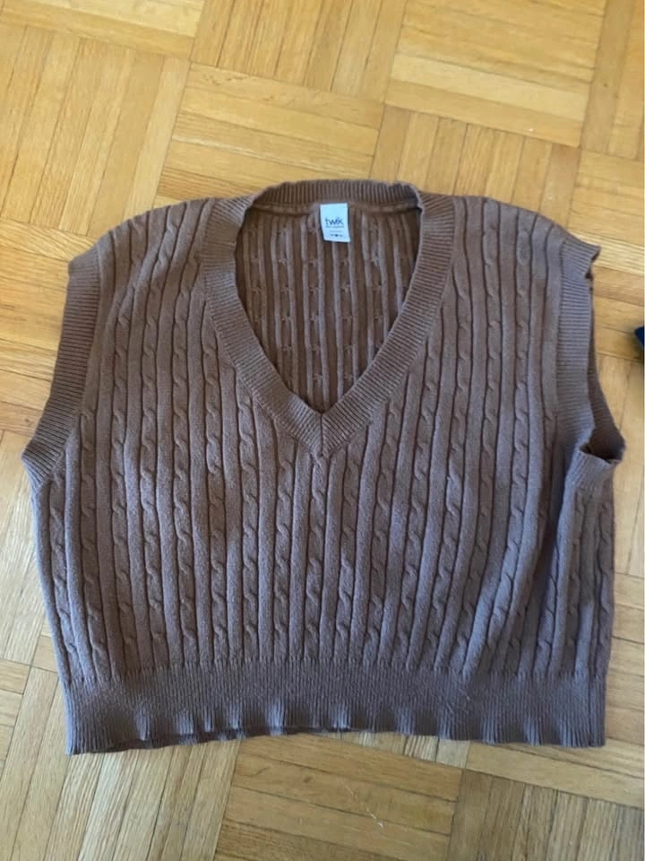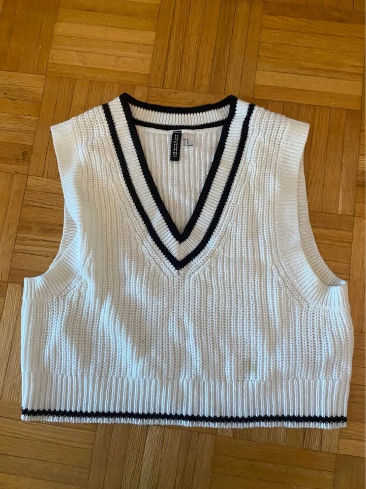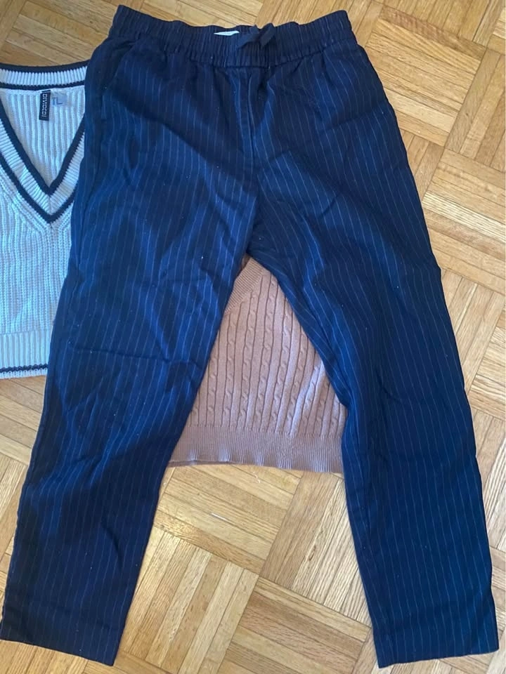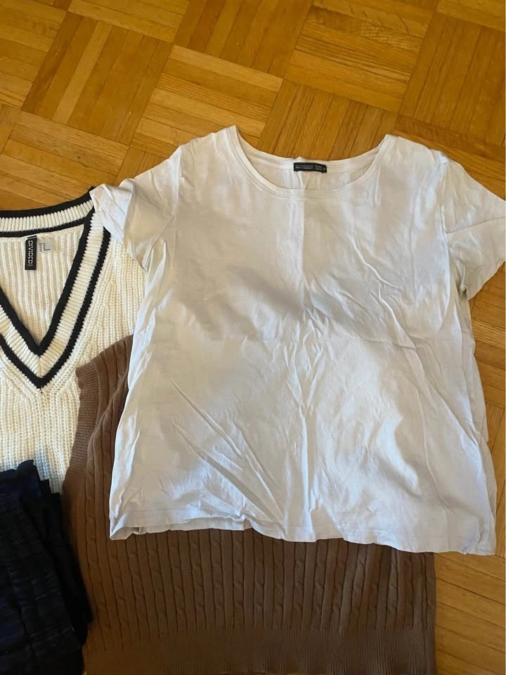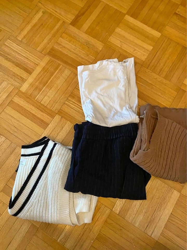Five clothing items Bundle includes 2 sweater vests (medium), 1 pair of H&M dress pants (size 8), 1 Plain white Zara Tee, and one tank top