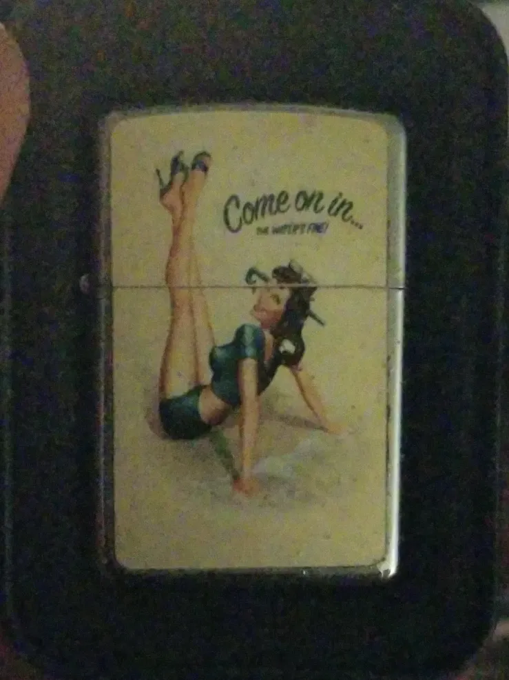 This is a cool lighter with a vintage pin-up girl design. It says "Come on in... the water's fine!". Made of metal with a classic flip-top design. It's a great collectible for lighter enthusiasts!