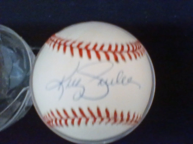 Kelly Gruber autographed vintage baseball. Features Rowlings Official American League (Barry Brown President) Cushioned Center RO-A. In excellent condition, though the case is cracked. Please see pictures for details.