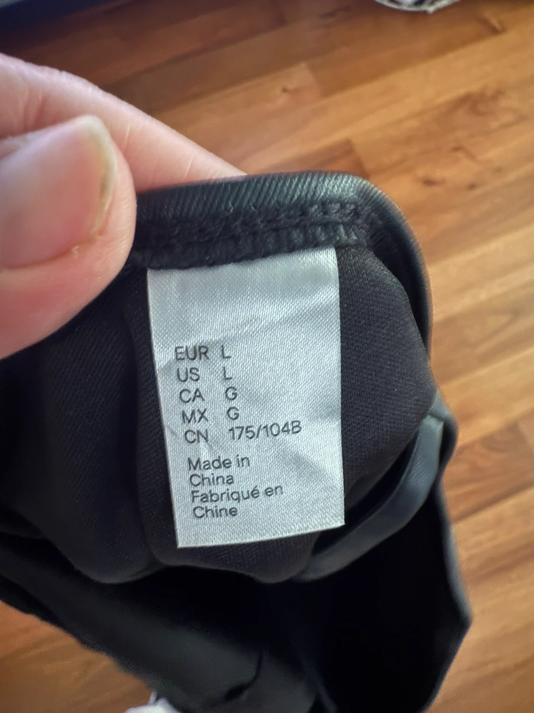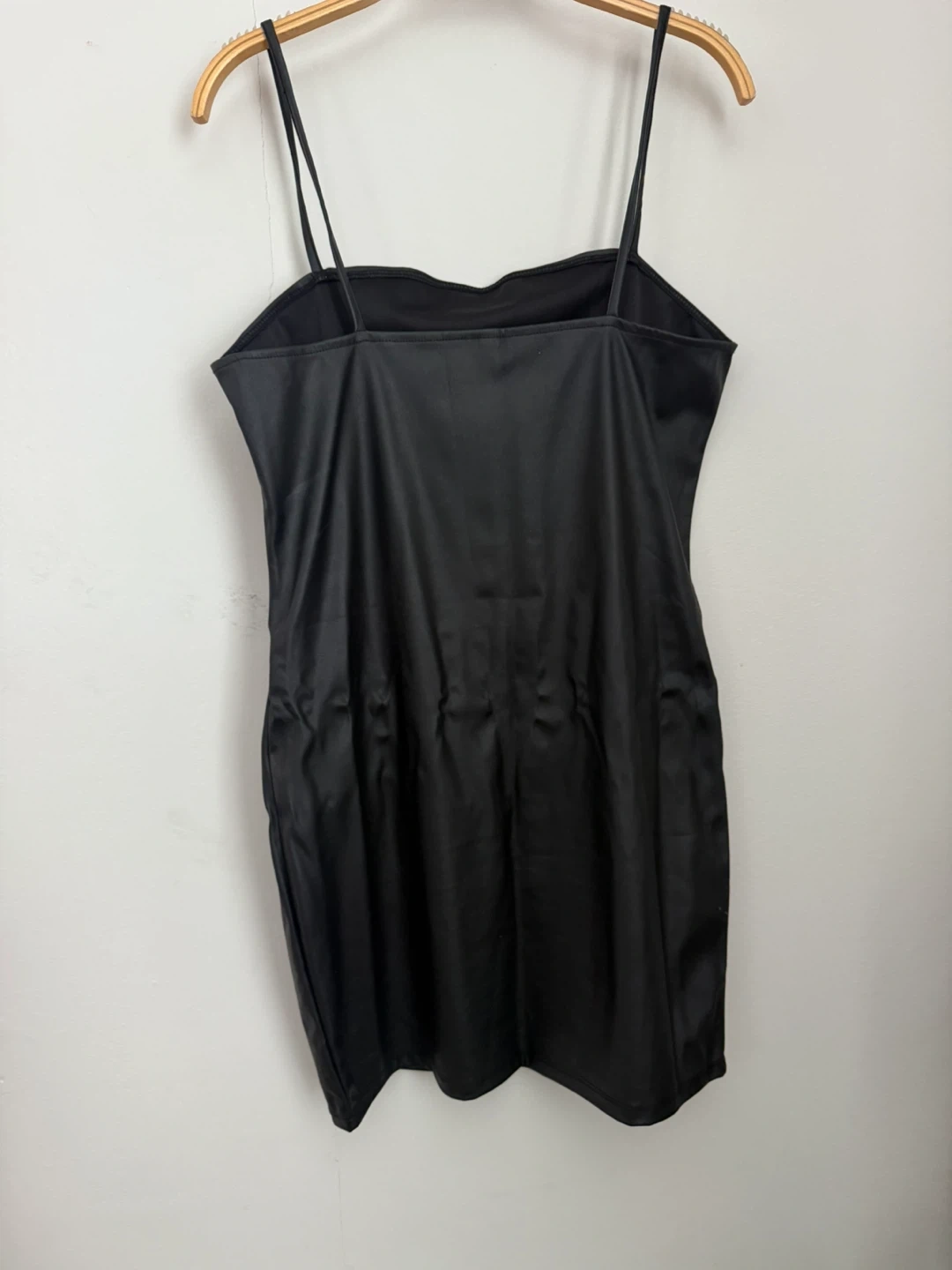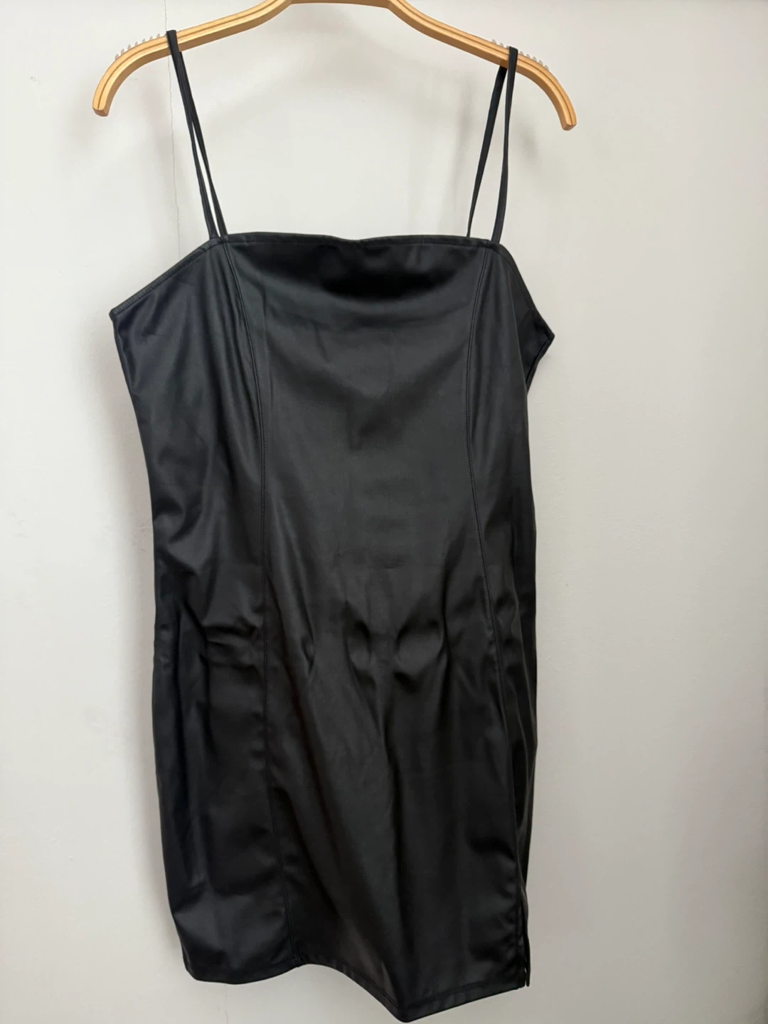 This black faux leather mini dress features a sleek design with thin spaghetti straps. It has a square neckline and a hem slit for ease of movement. Made in China. Size is large.