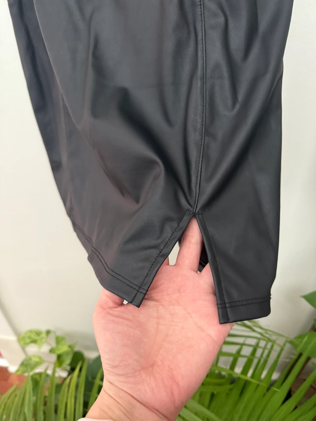 This black faux leather mini dress features a sleek design with thin spaghetti straps. It has a square neckline and a hem slit for ease of movement. Made in China. Size is large.