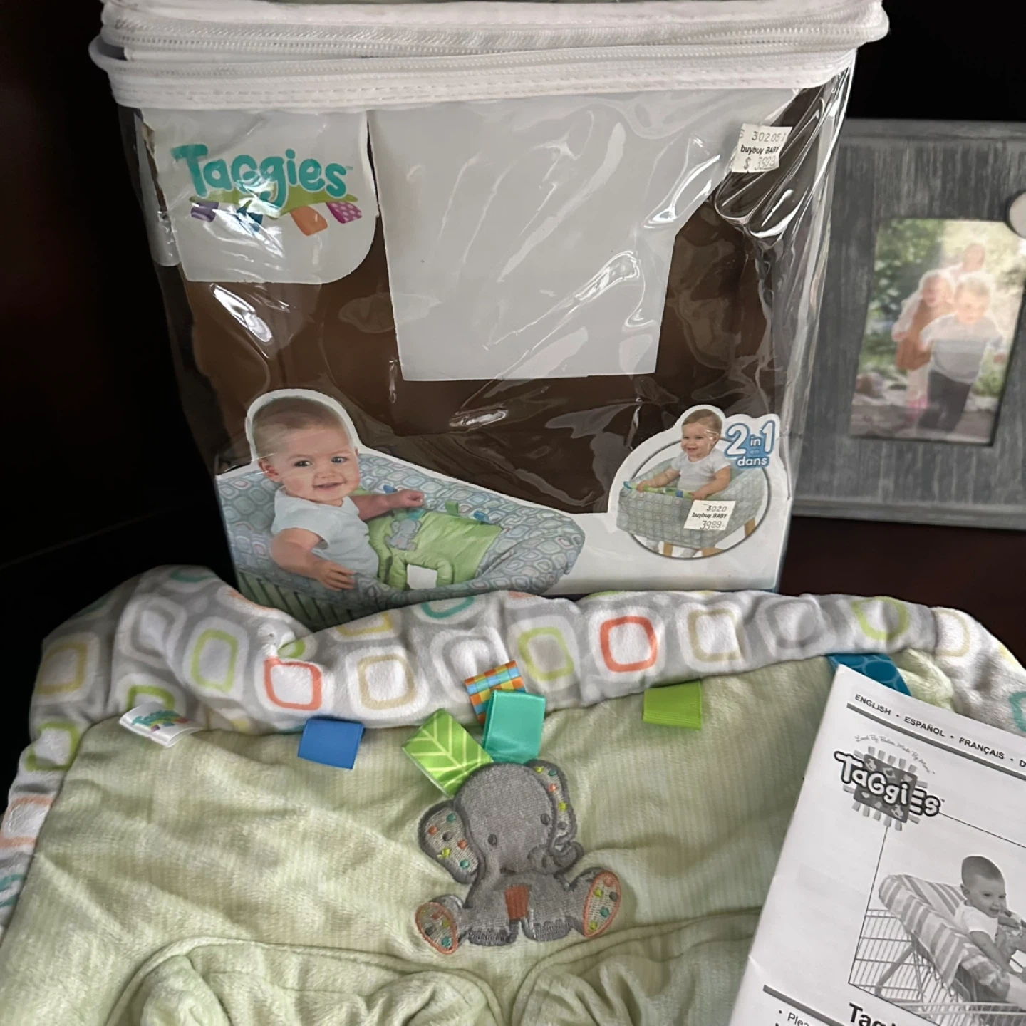 This Taggies Tag n' Go Cart Cover provides comfort and safety for your baby. It's made with deluxe fabrics and features soothing tags for engagement. The cover has a 3-point safety harness and is washable.