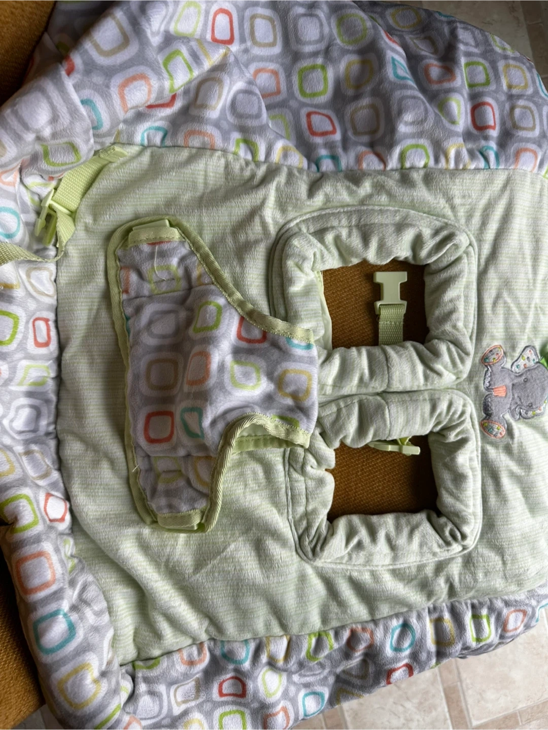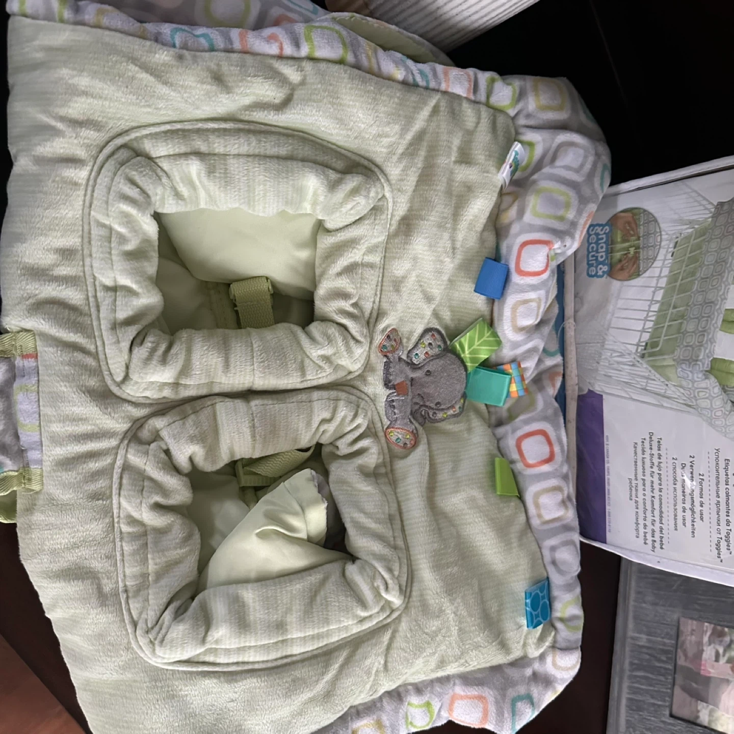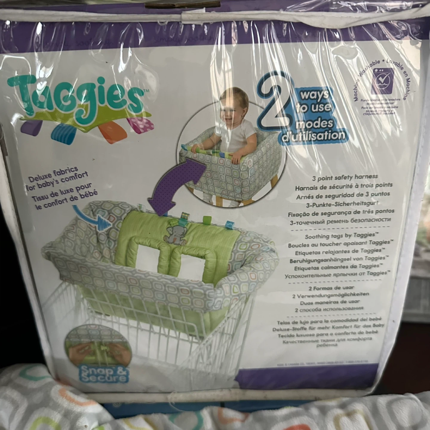 This Taggies Tag n' Go Cart Cover provides comfort and safety for your baby. It's made with deluxe fabrics and features soothing tags for engagement. The cover has a 3-point safety harness and is washable.