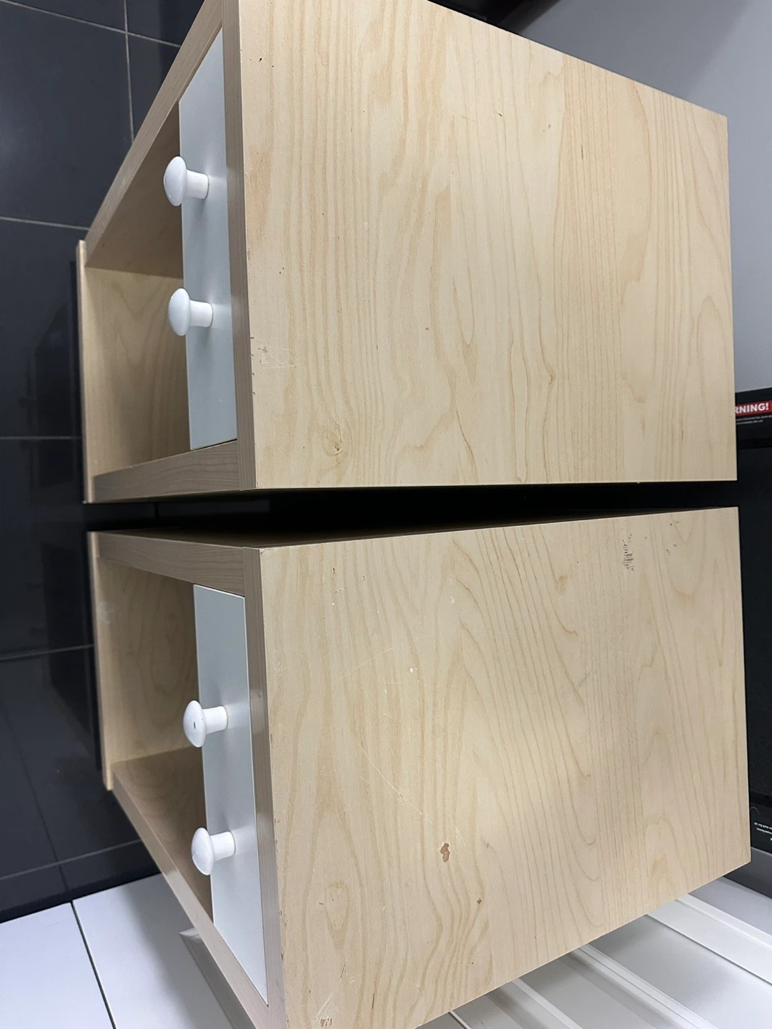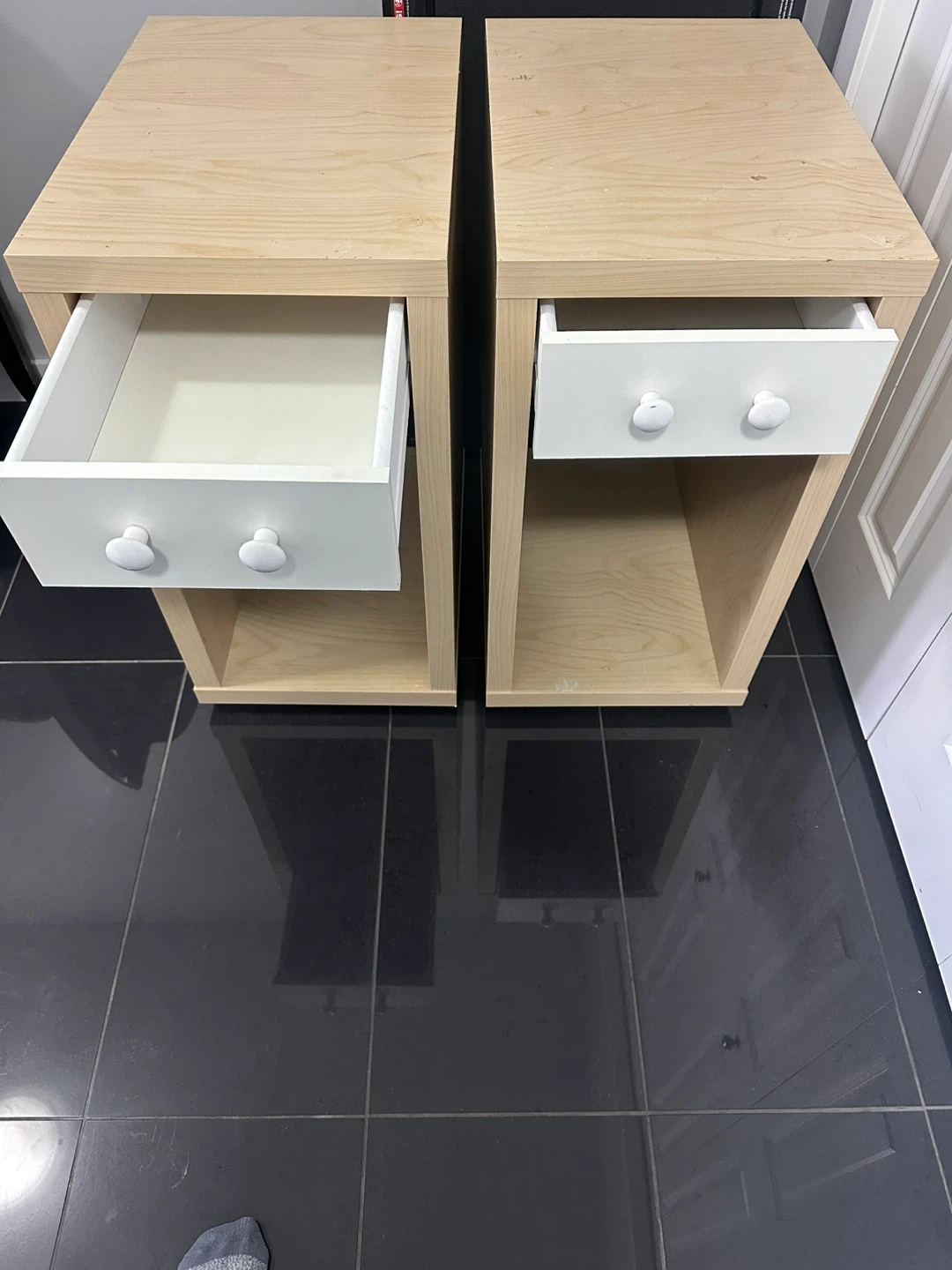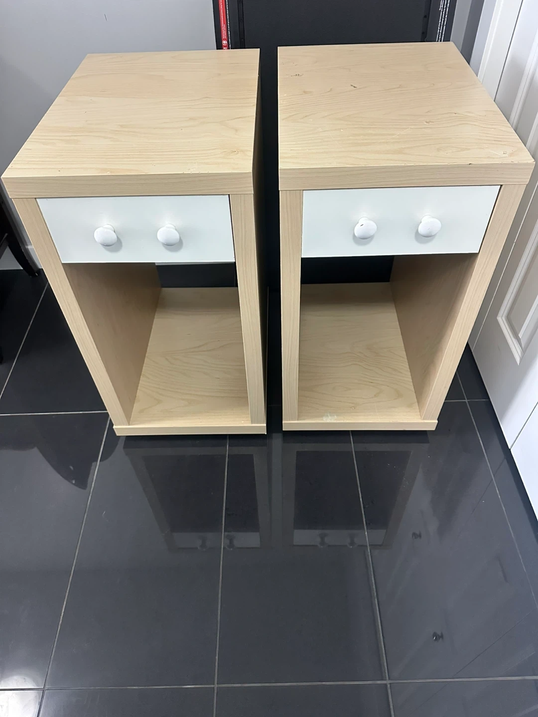 Selling a pair of bedside tables. They are light wood with a white drawer and round white knobs. They have storage space and show signs of use, but are in good condition and work perfectly.
