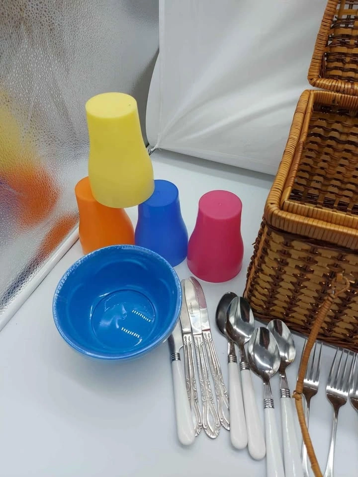 Vintage Wicker Basket with Set Of 4 Dinnerware