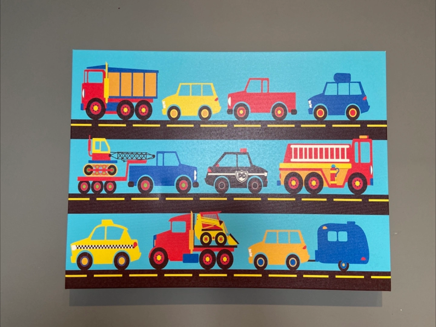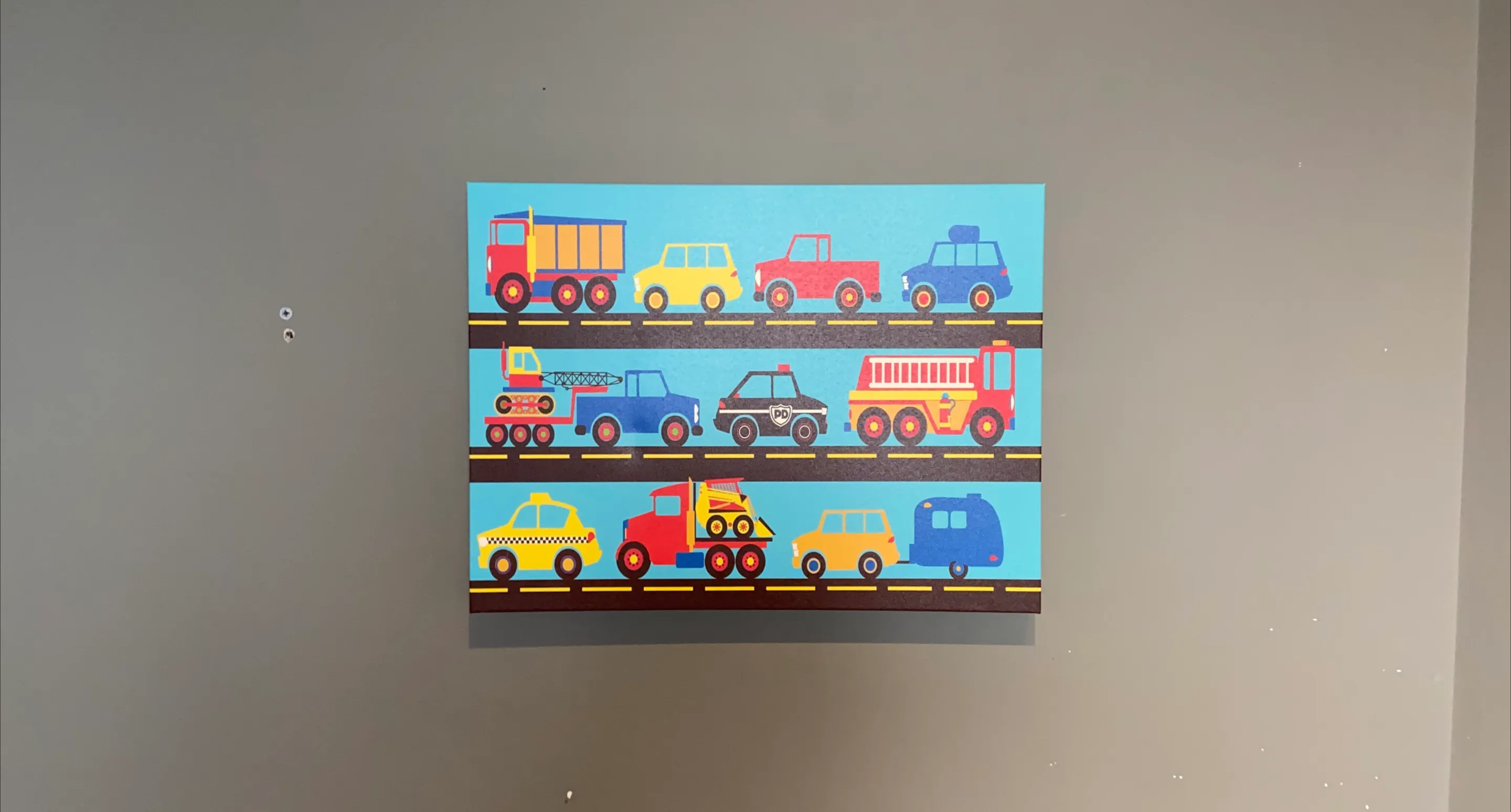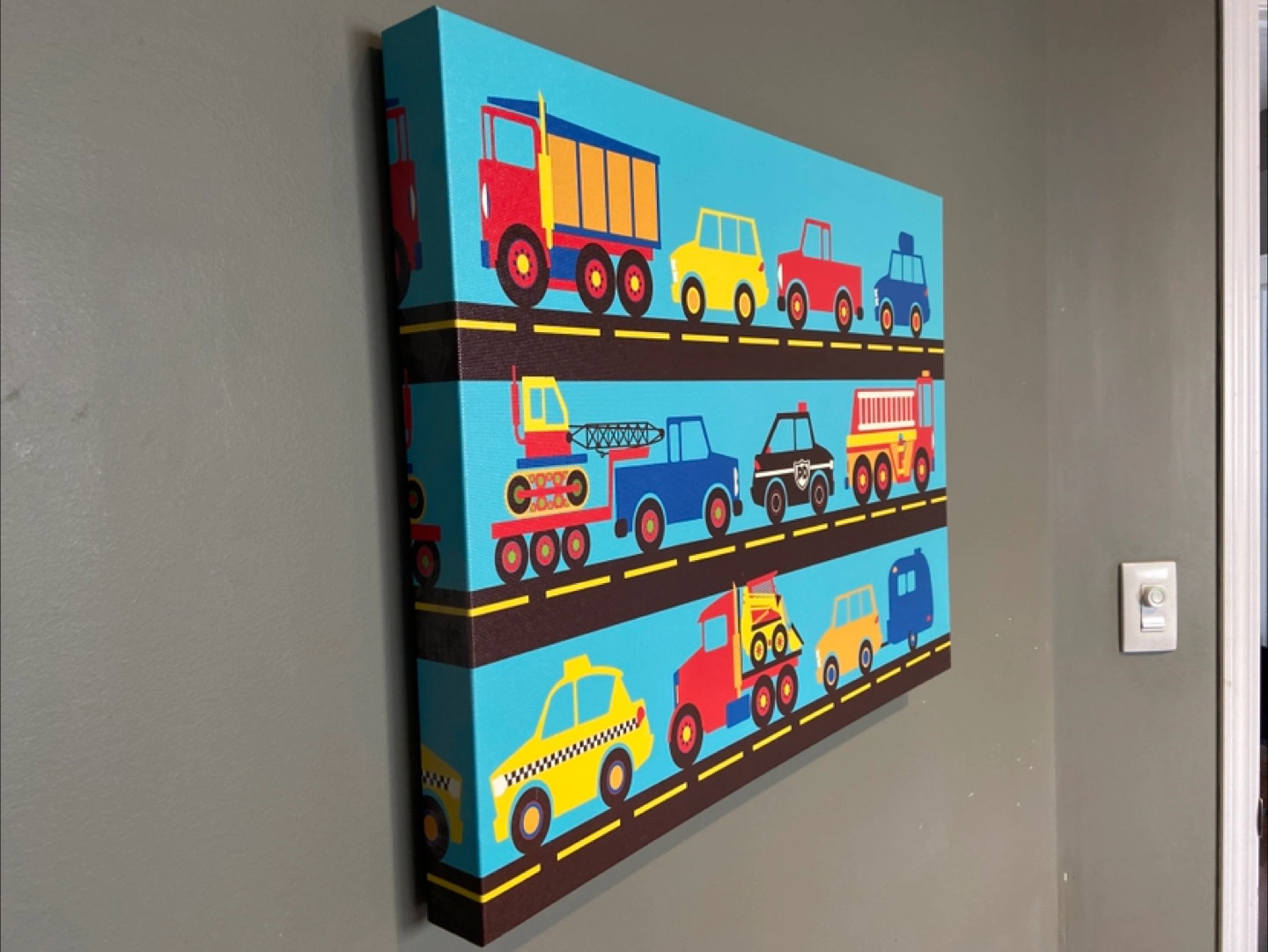 Adorable canvas print featuring a variety of vehicles including trucks, cars, a police car and fire truck! Very cute for a child's room or nursery. Size is 24”x18”