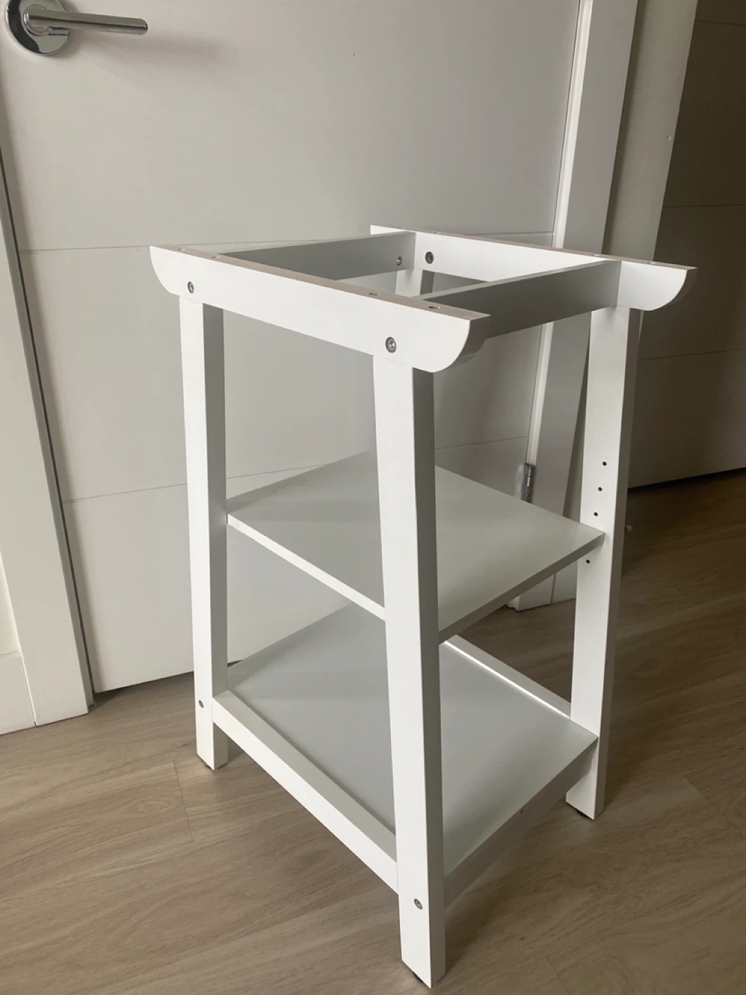 A simple white three-tier shelf unit is available. Its frame is white wood and it has three shelves. This unit could be useful for organizing items in a smaller space.