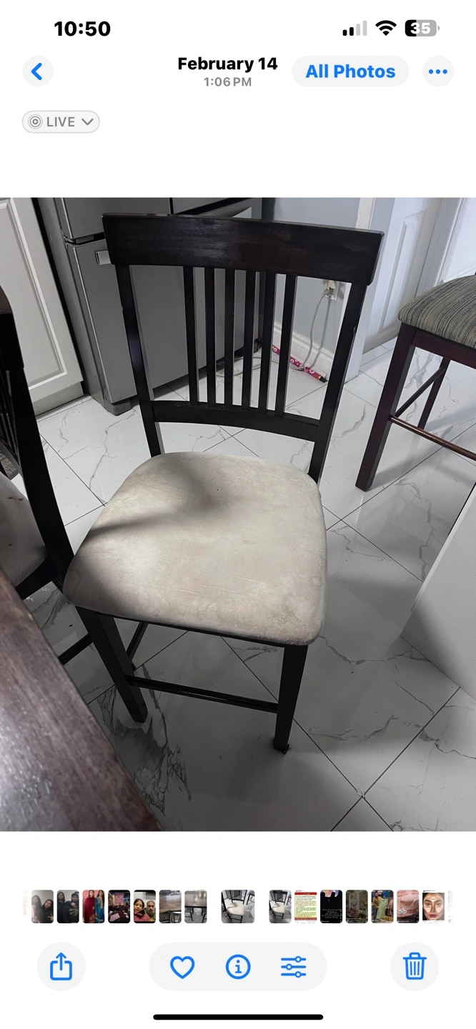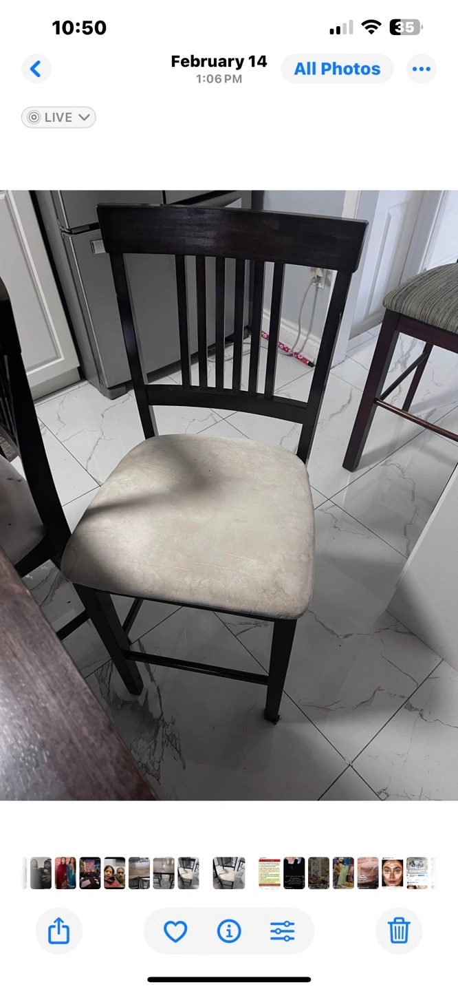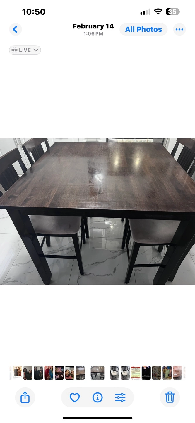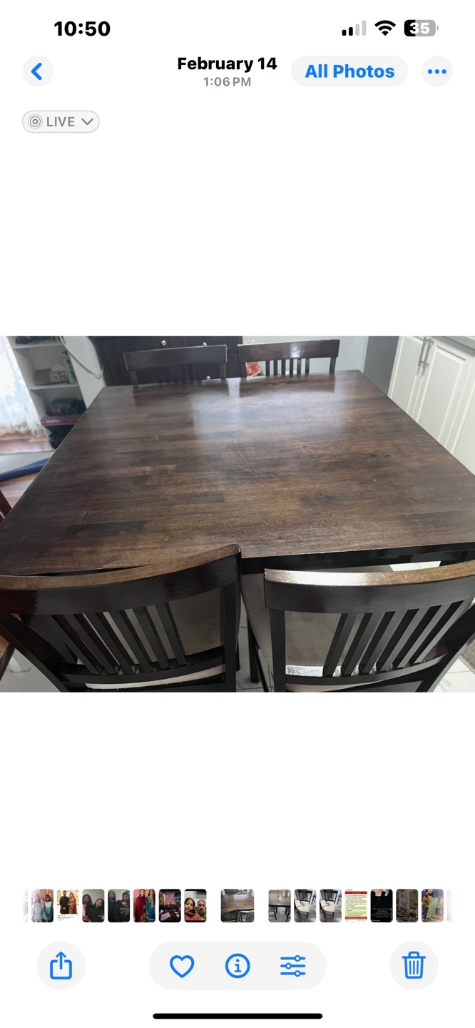 Square kitchen table with four matching chairs. Dark brown wood finish. Simple, classic design. Good for small spaces.