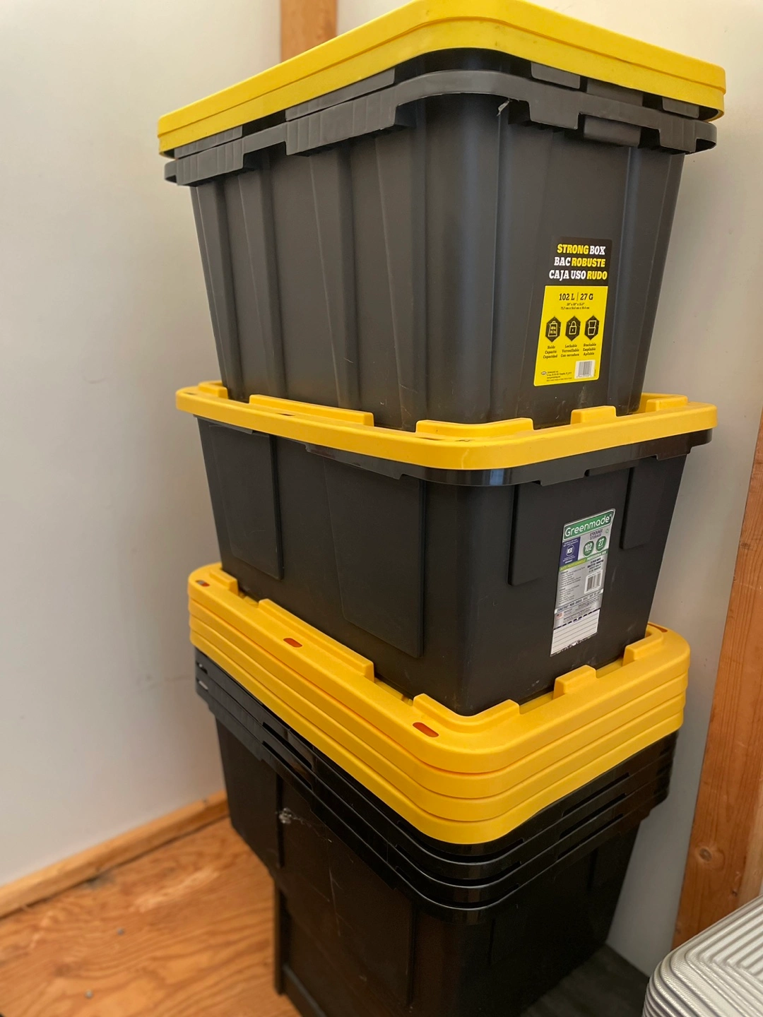 Three black plastic storage containers with yellow lids. Good for organizing or moving. StrongBox and GreenMade brands represented. 9 108L storage bin $10 each