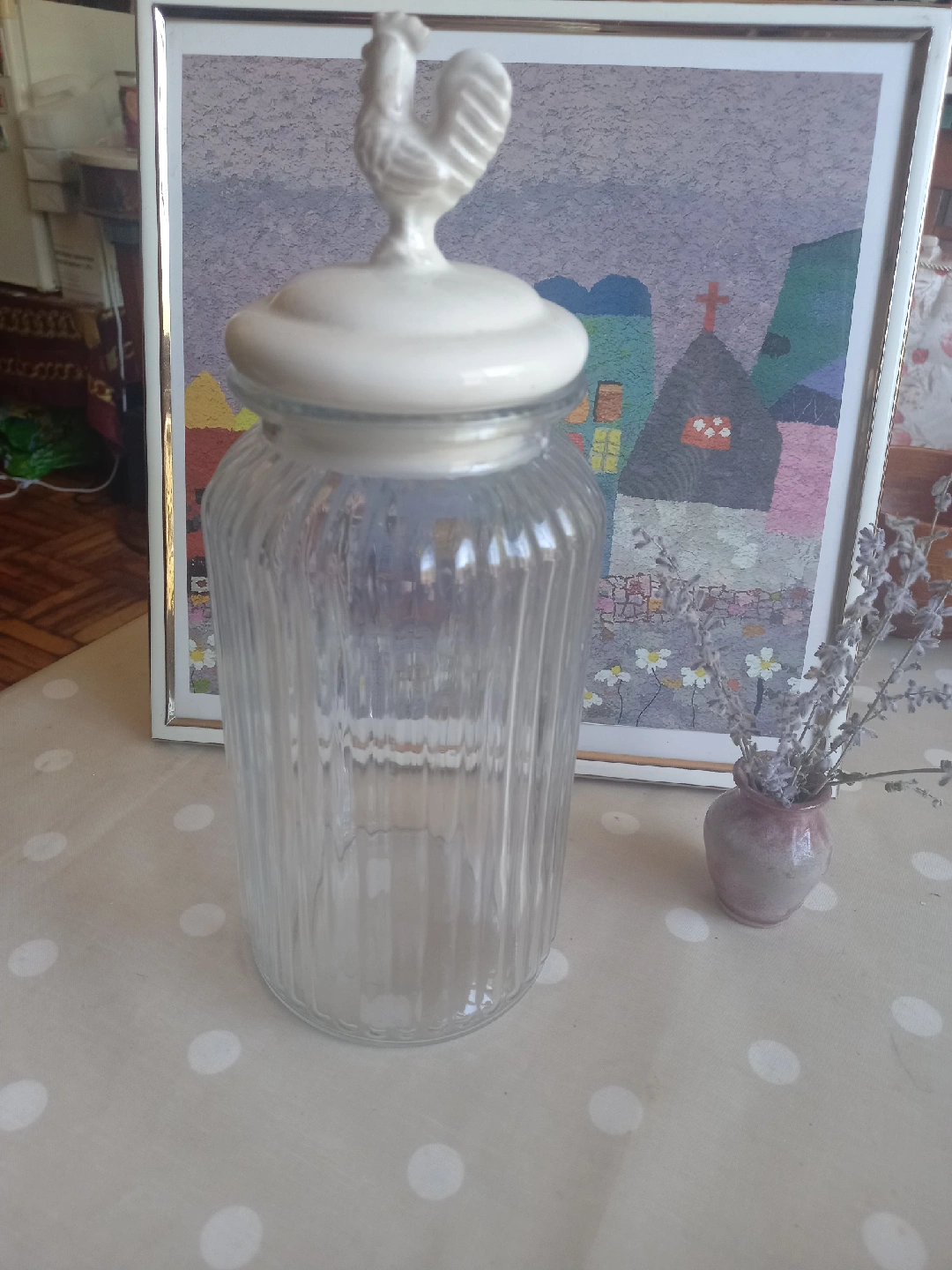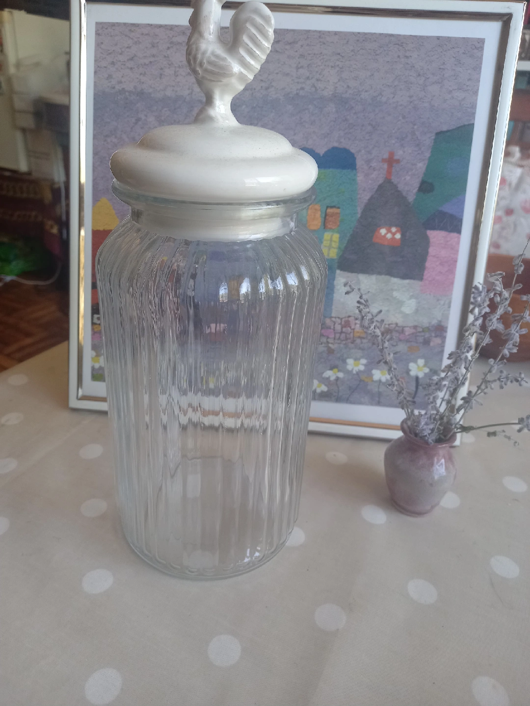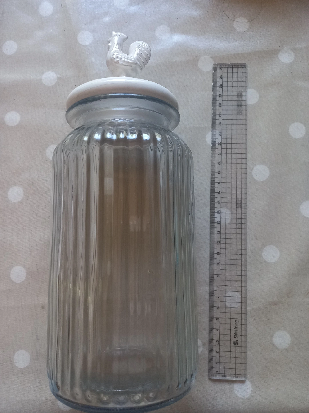 Clear glass jar with a ribbed texture and a white lid featuring a rooster figurine on top. Perfect for storing dry goods or adding a touch of farmhouse charm to your kitchen!