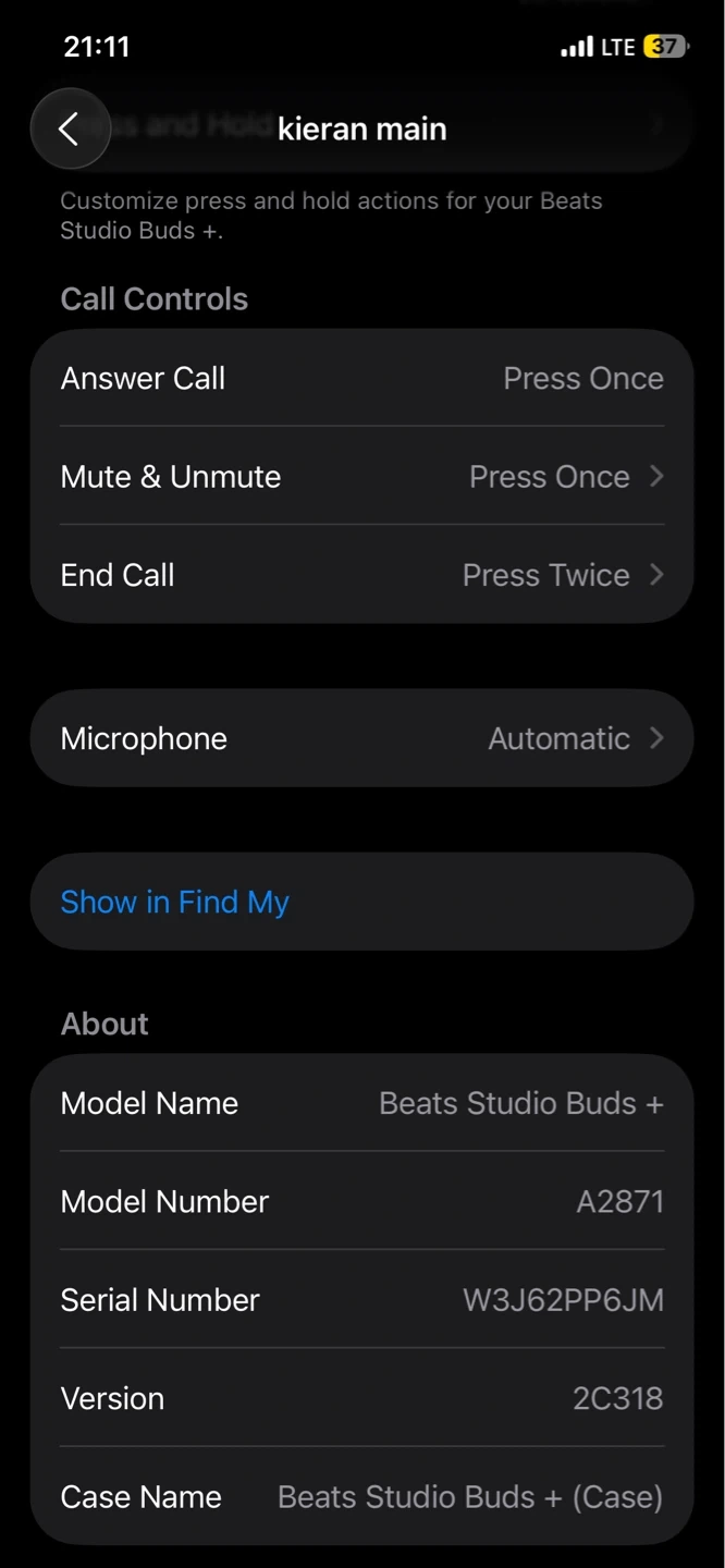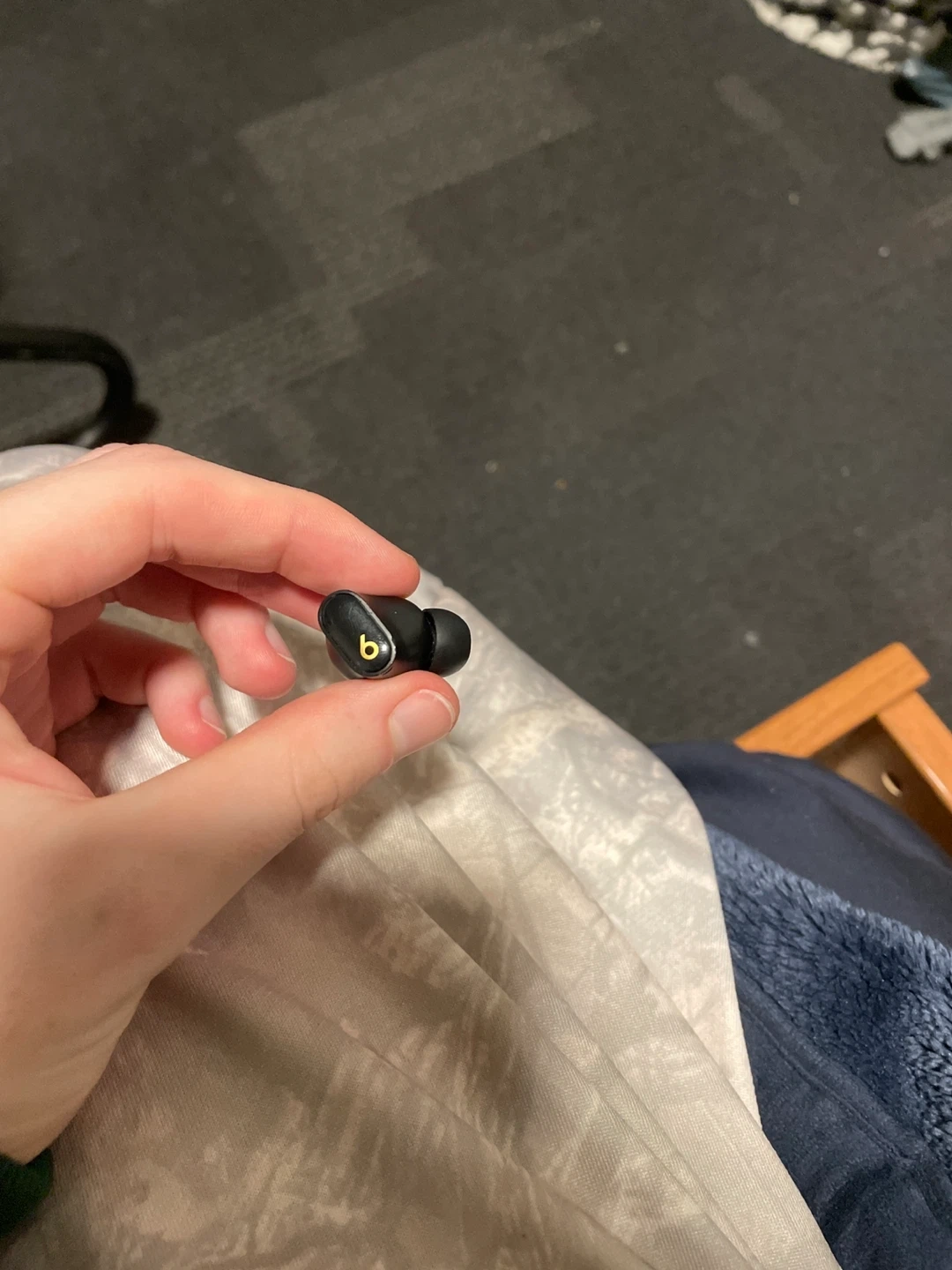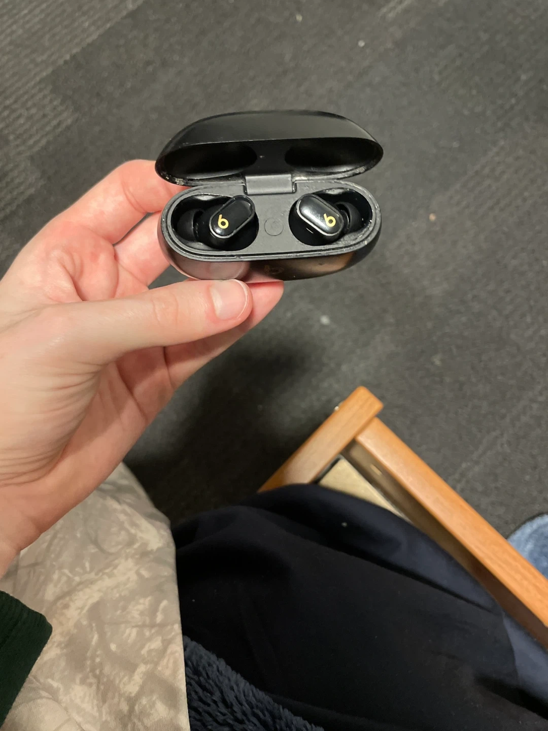 Black wireless earbuds from Beats. Includes charging case. These earbuds provide a great listening experience for music or calls. Noise cancellation and transparency modes for active listening. Been used for 6 months (no damage, see pics) and cleaned, will be fully cleaned once again on purchase. You can test them at the meetup to validate. USB-C not included