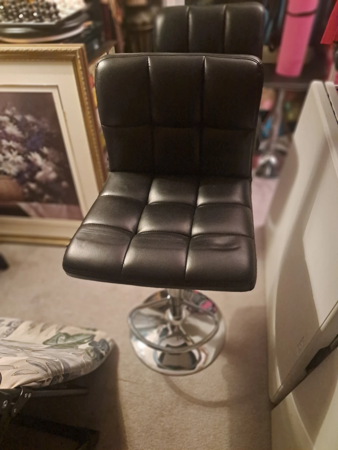 This black bar stool features a padded faux leather seat and a sturdy chrome base. It's adjustable in height for your convenience. These stools are great for a home bar or kitchen island. Selling both for $50.