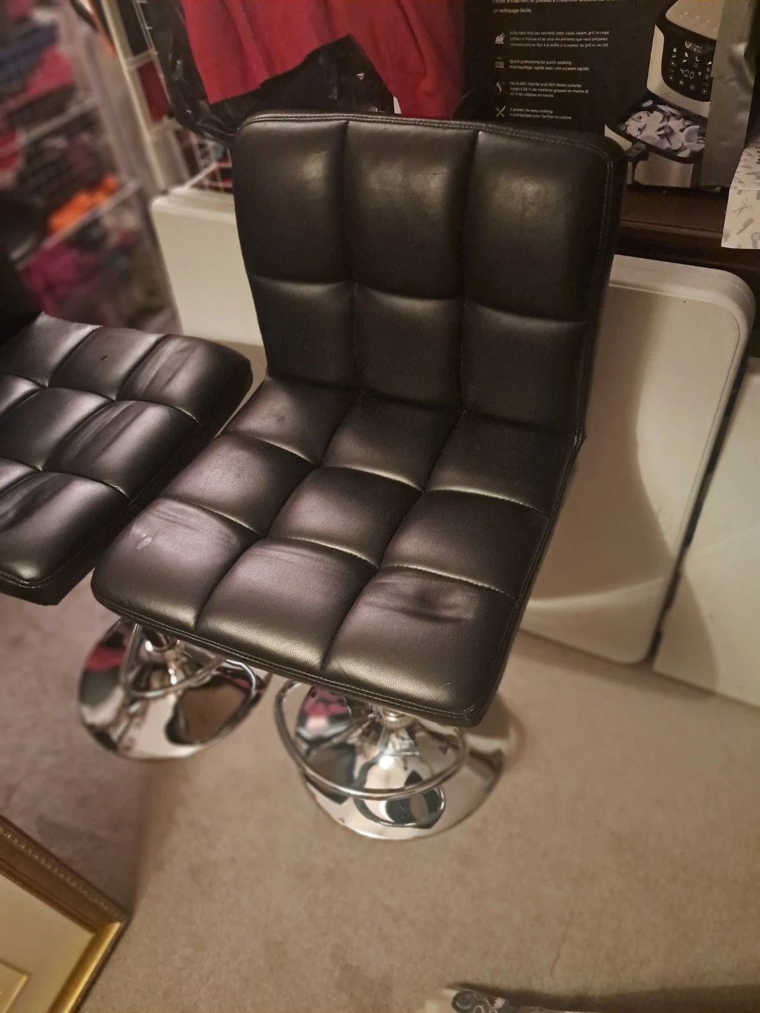 This black bar stool features a padded faux leather seat and a sturdy chrome base. It's adjustable in height for your convenience. These stools are great for a home bar or kitchen island. Selling both for $50.