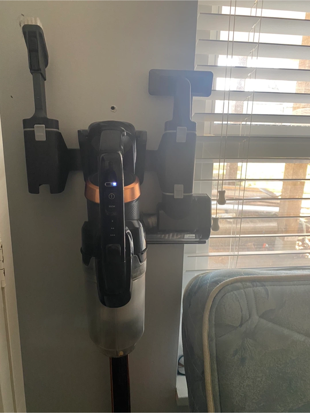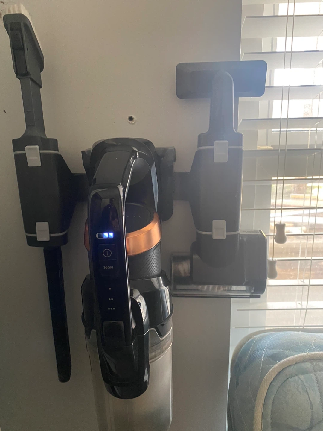 This is a cordless stick vacuum cleaner. It's a 300W model. It comes with a wall mount and various attachments for cleaning different surfaces.