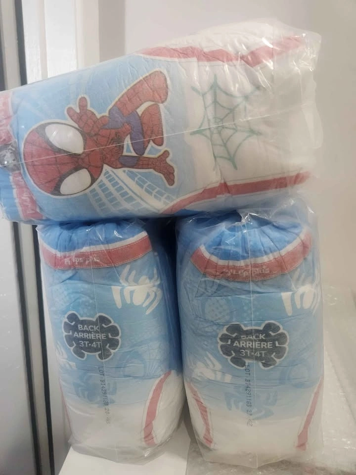 New packs of Spider-Man pull-ups, size 3T-4T. Got a few packs, great for little ones. Price: $30 for all. $10 per sleeve (29-30 individual diapers per bag/sleeve). Meet Location: Pickering.