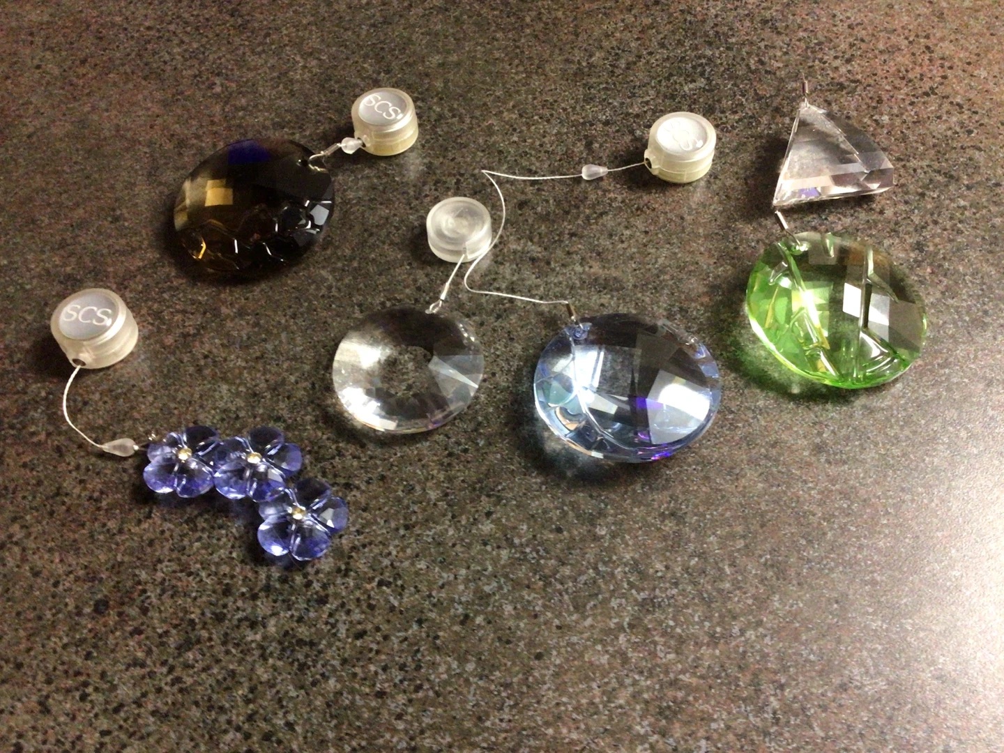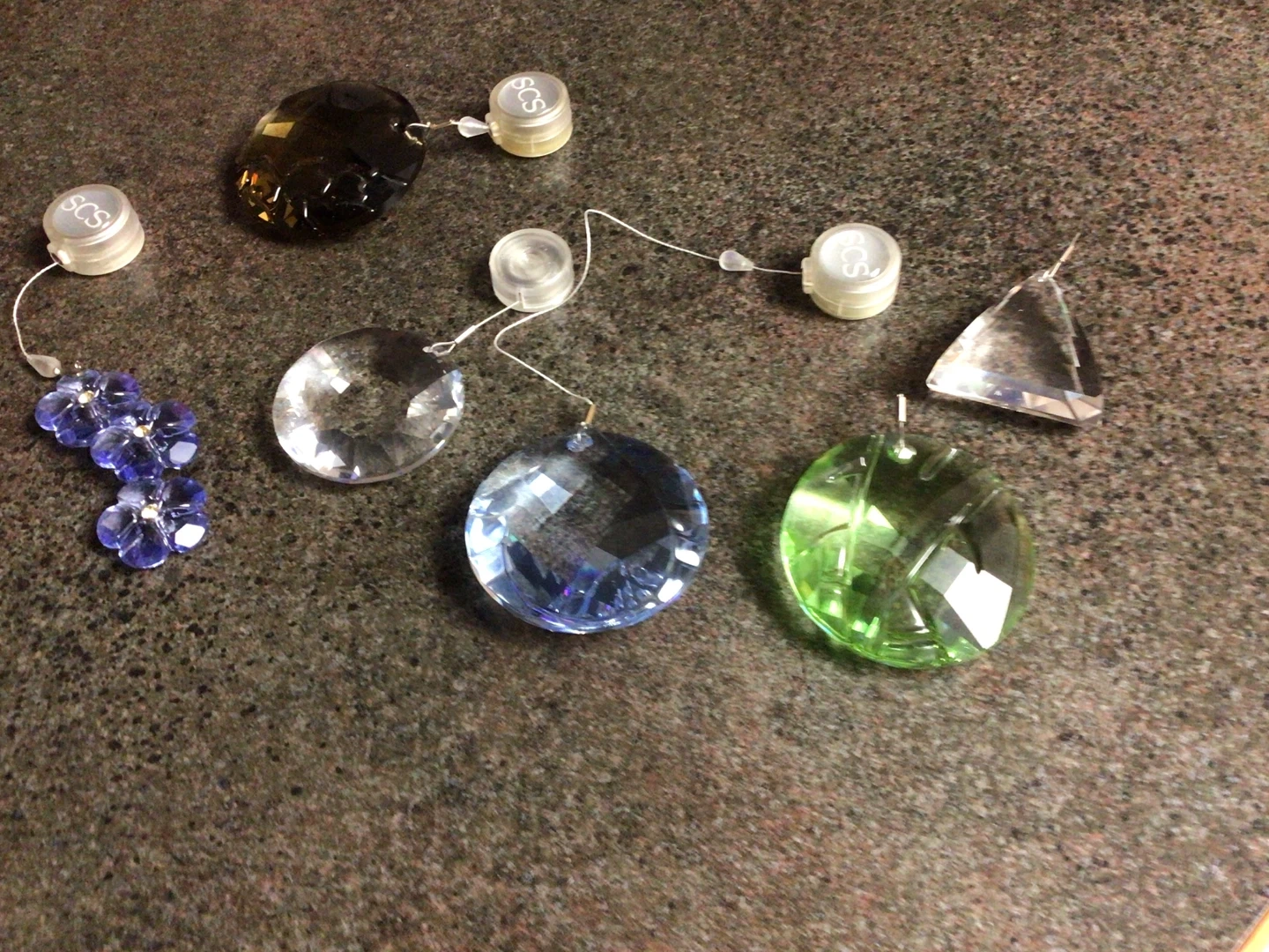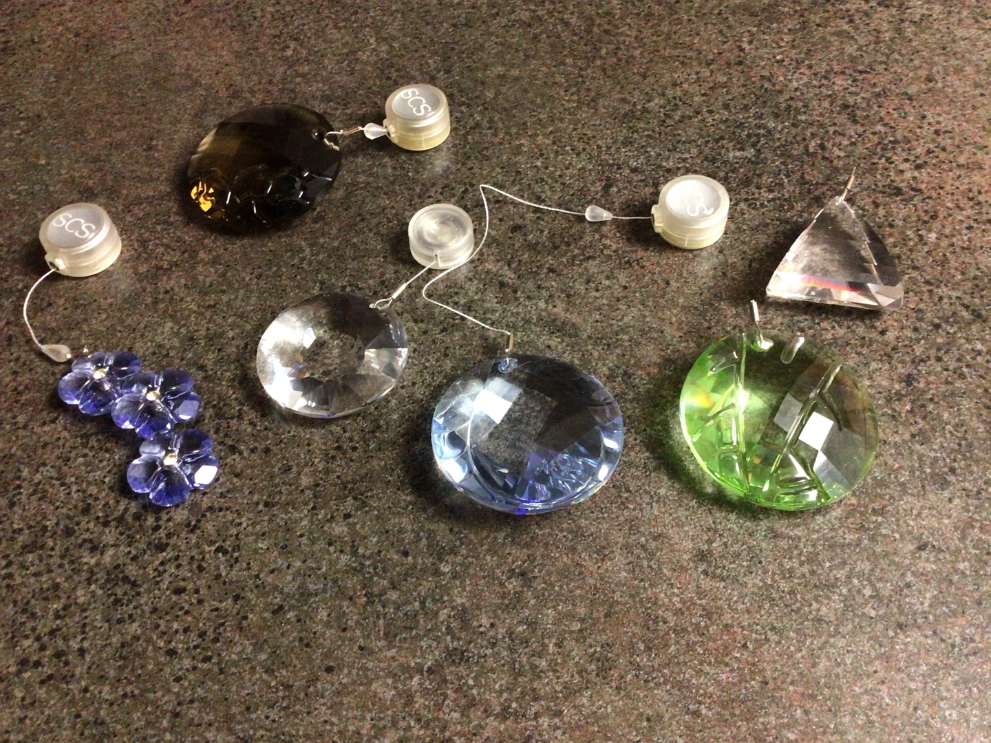They come in various shapes and colours, including blue, green, clear, and brown. Each pendant has a small SCS connector. Perfect for adding a touch of sparkle to your home!