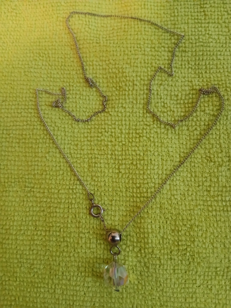A delicate silver chain necklace featuring a sparkling clear crystal pendant. The chain has an adjustable clasp for a comfortable fit.