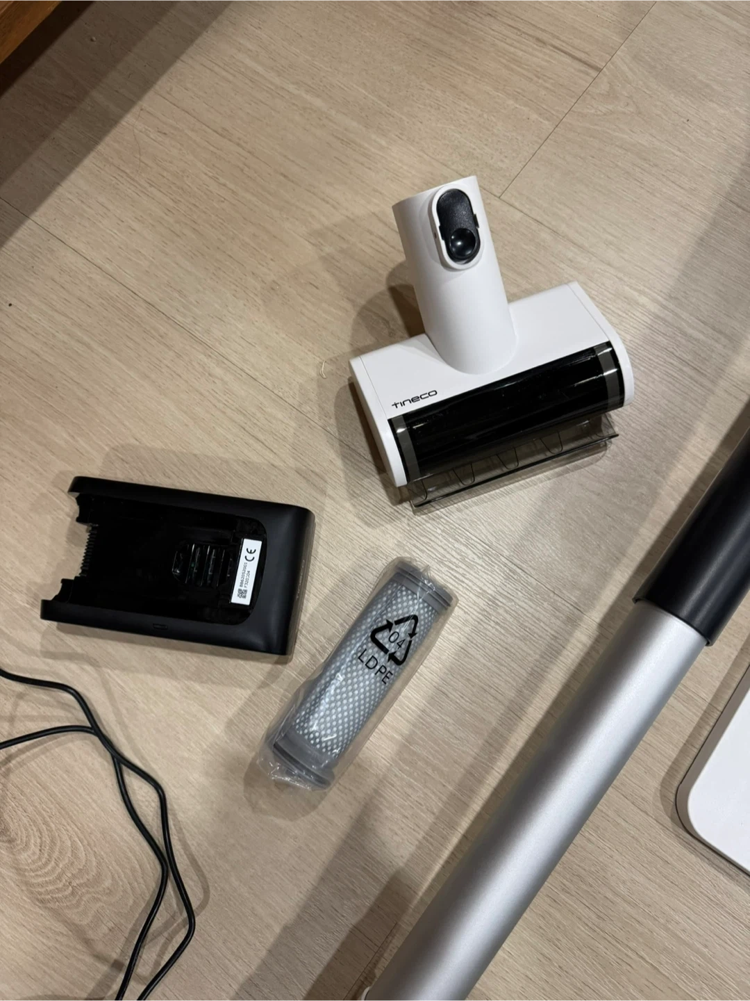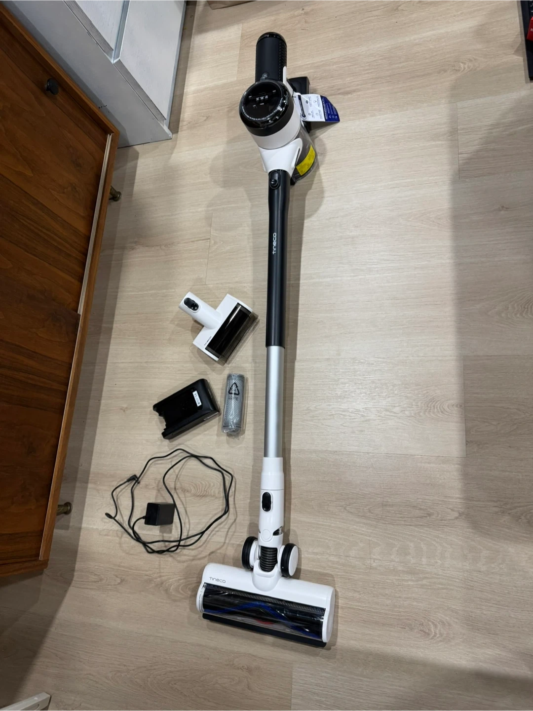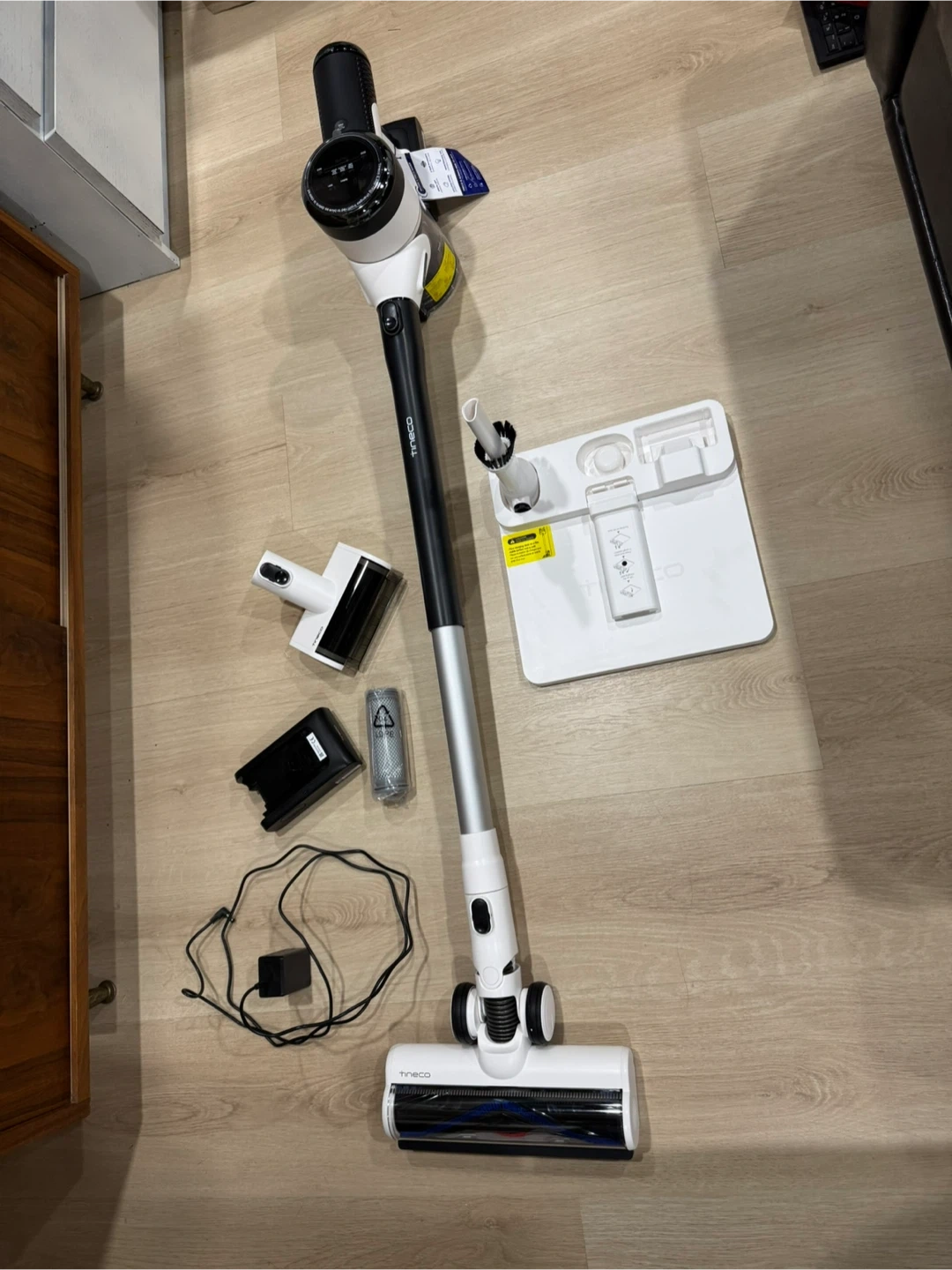 BRAND NEW NEVER USED. Tineco cordless vacuum cleaner. Comes with charging base, power adapter, and various attachments. Includes a spare filter.