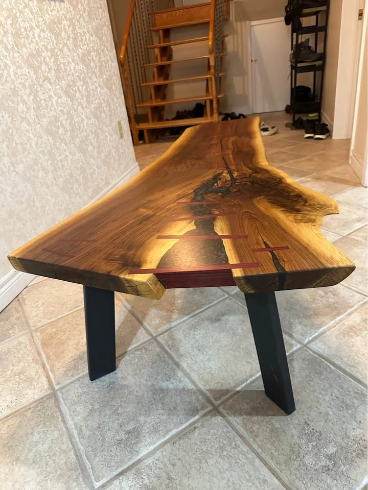 Beautiful handmade live edge solid wood table featuring an epoxy river design and decorative bowtie inlays. Natural wood grain with a unique organic shape and modern black metal legs. Perfect as a coffee table, entry bench, or statement piece for modern or rustic interiors. Good condition.