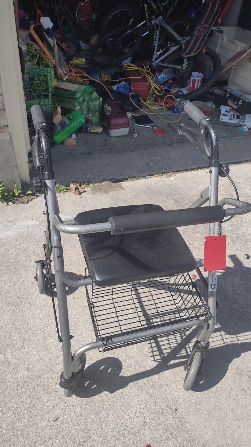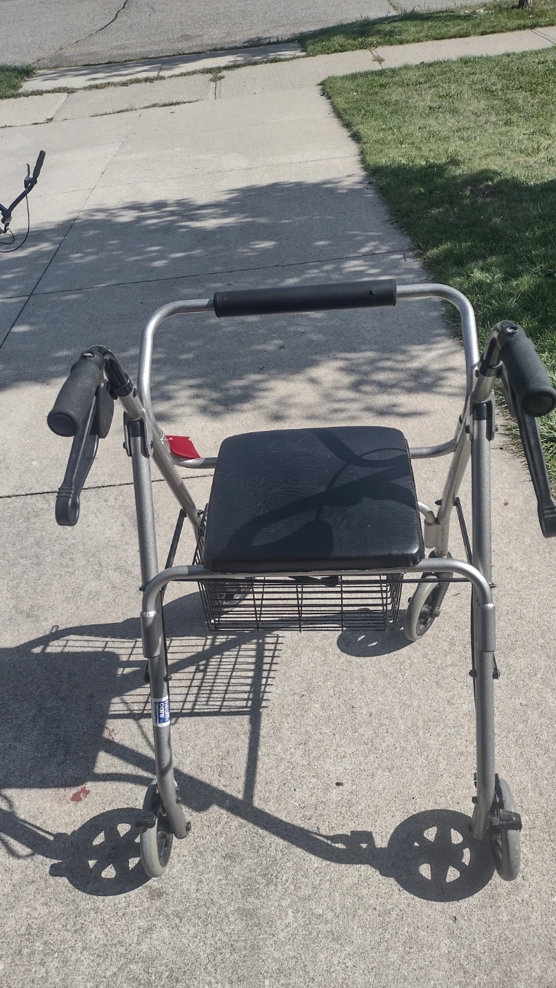 This walker features a built-in seat and a storage basket for convenience. It's designed for mobility assistance. The frame is silver-coloured metal. This walker is great for anyone needing support while moving around.