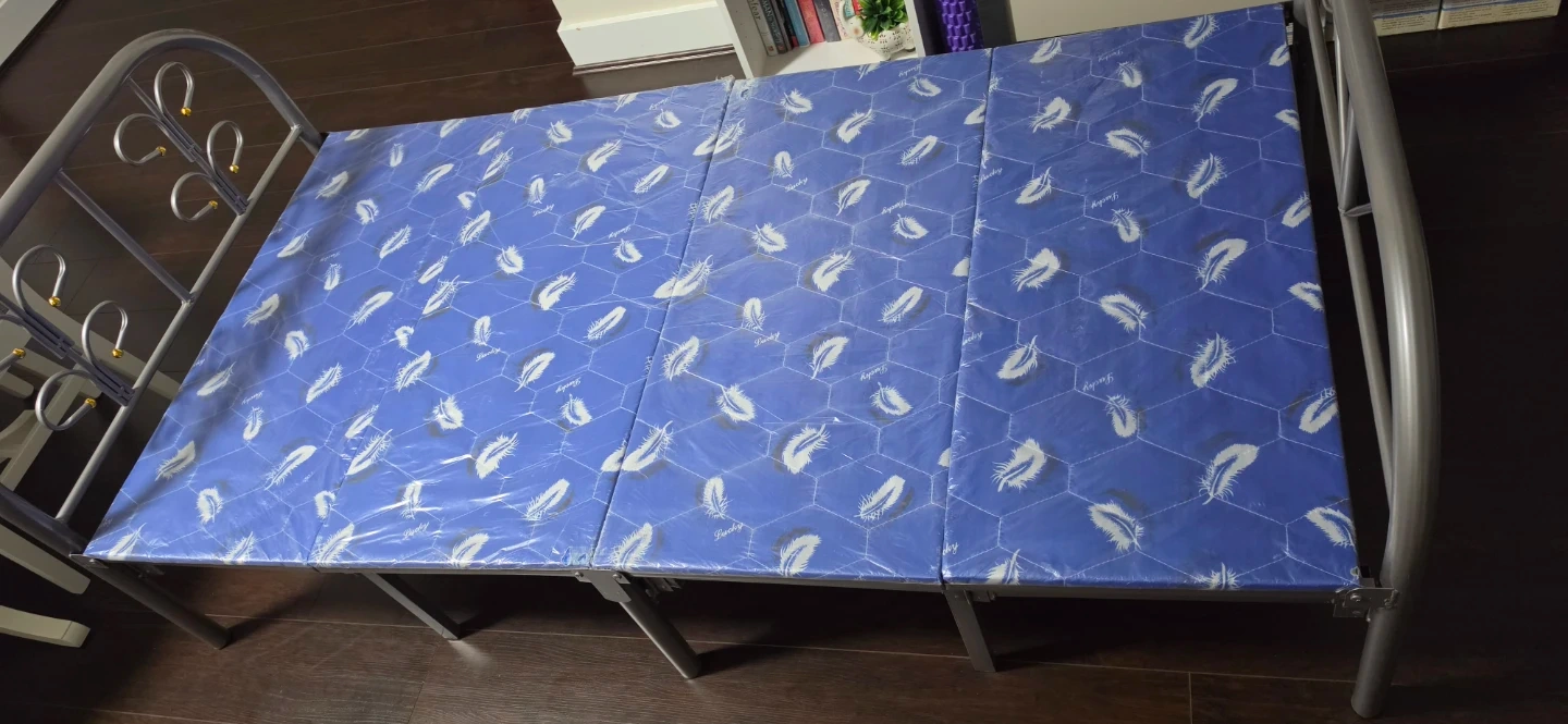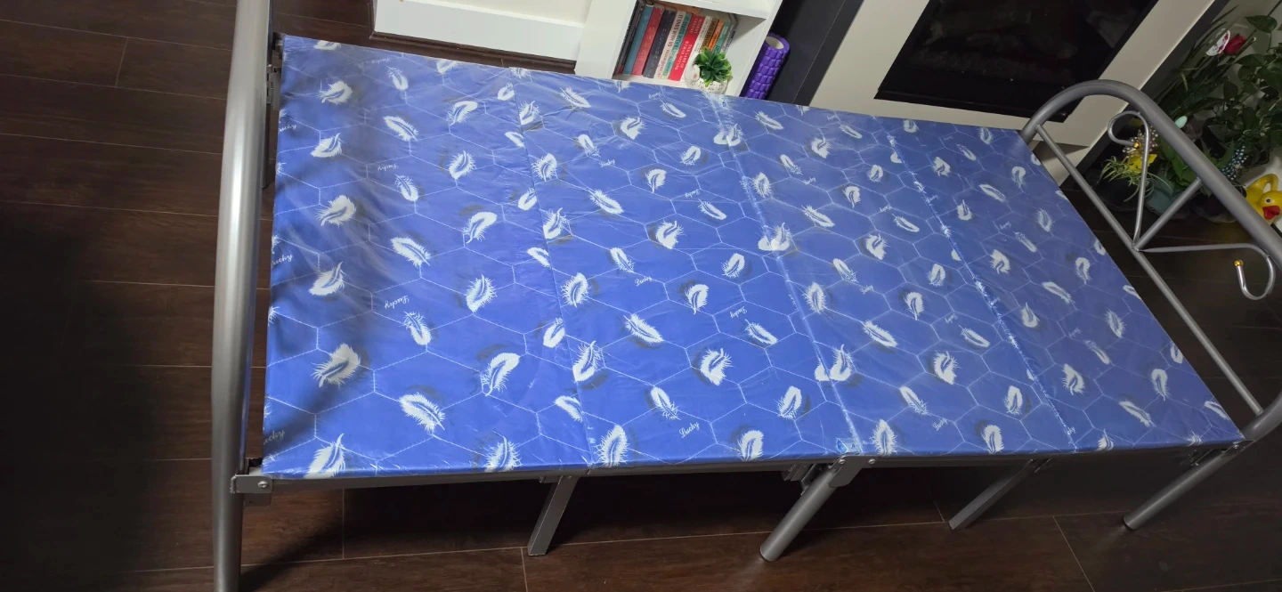 A folding bed with a blue patterned mattress. It's easy to set up and store. Great for guests or small spaces!