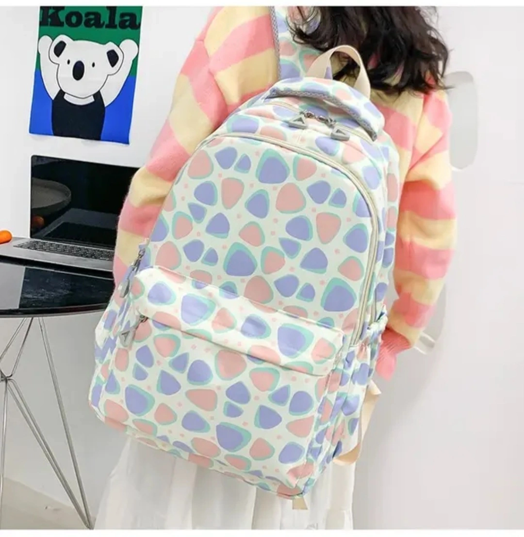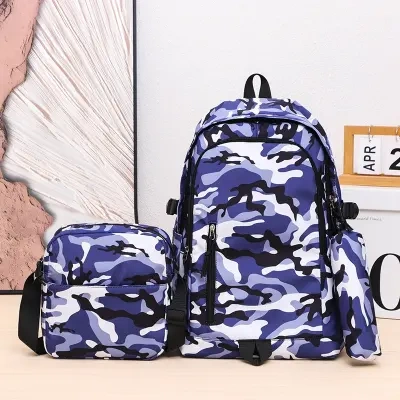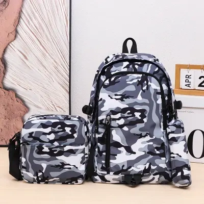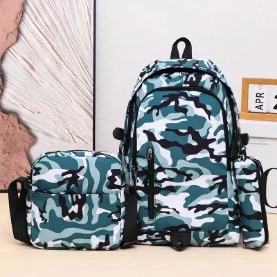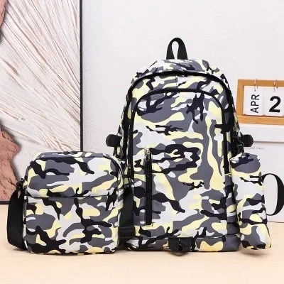 A set of three bags - a backpack, a shoulder bag, and a pencil case - in a camouflage print. The set features a large backpack, a smaller shoulder bag for everyday use, and a pencil case to keep school supplies organized.