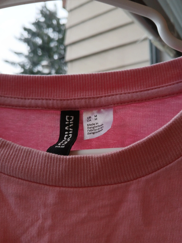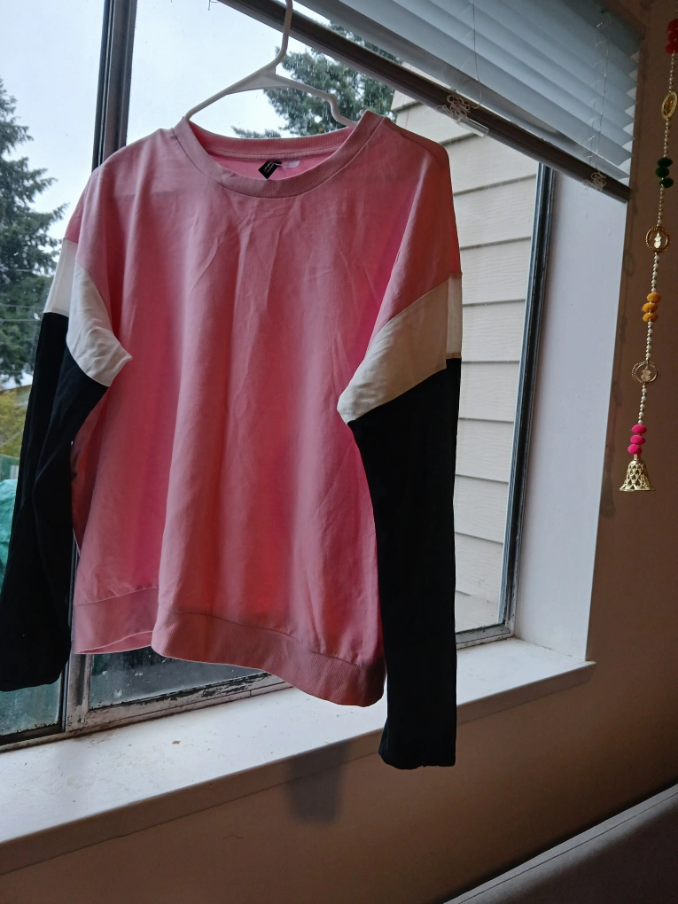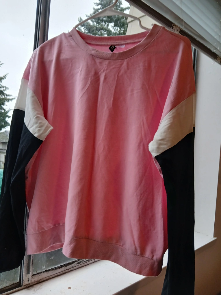 Long sleeve sweater with pink body, black sleeves and white accents. Size M.