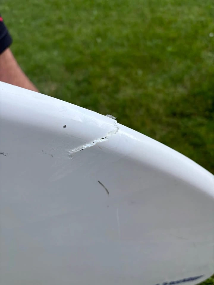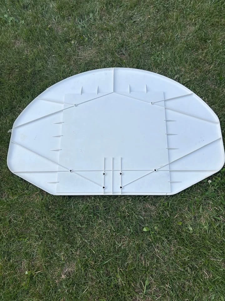 It has never been assembled or used, but has sat in my garage for years. Collecting dust has a couple of scratches and one small crack in the corner as shown some of the photos. It is also missing the bolts to connect the two pieces. These bolts can be found at any local appliance stores.