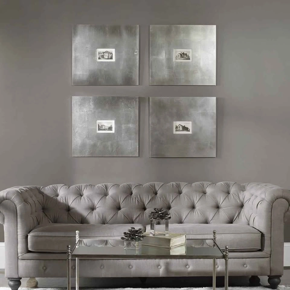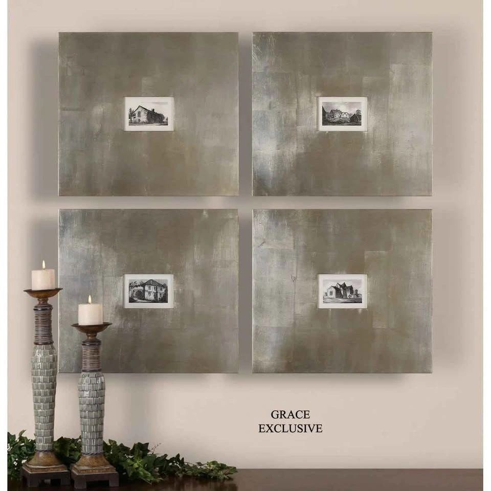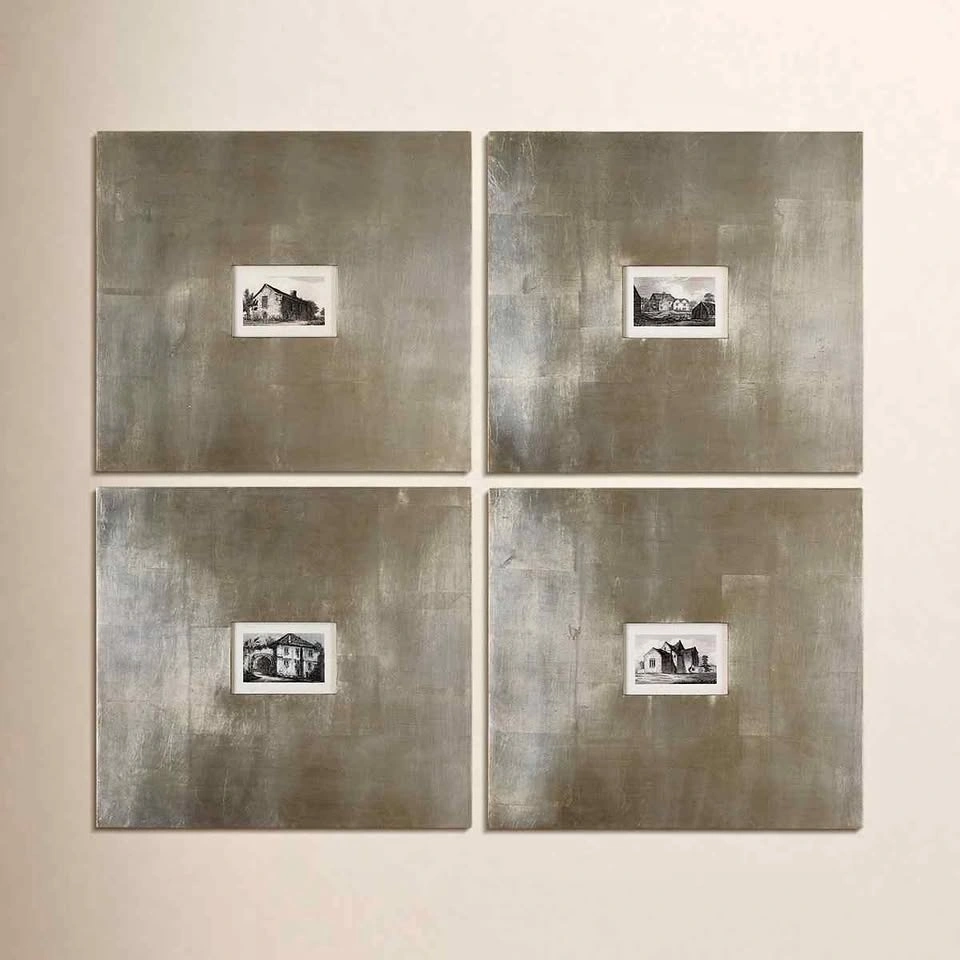 Set of 4 framed graphic art prints by Grace Feyock. Each print is approximately 21" H x 23" L. The total framed size for the set is approximately 42" H x 46" W. These sepia images of historic buildings are printed on paper and come in oversized square frames with an aged silver foil base and a light brown varnish. Each print is protected by a glass panel. Wall mounting hardware is included. Feel free to message if you have any questions!