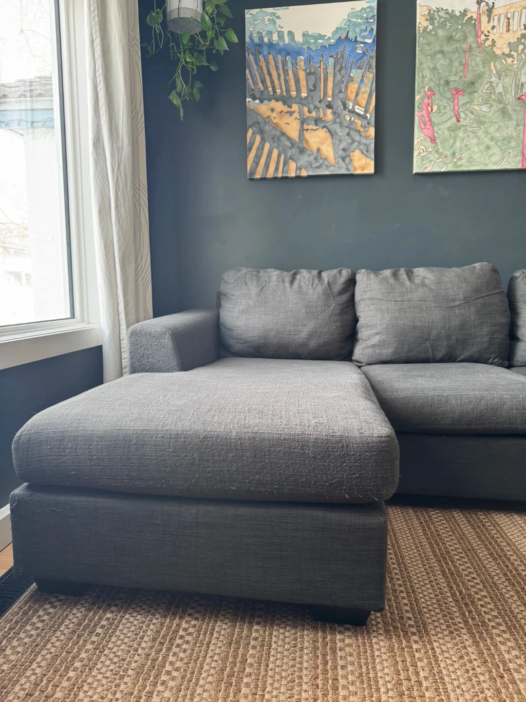 The couch has some scratches from the cat and probably needs some cleaning.