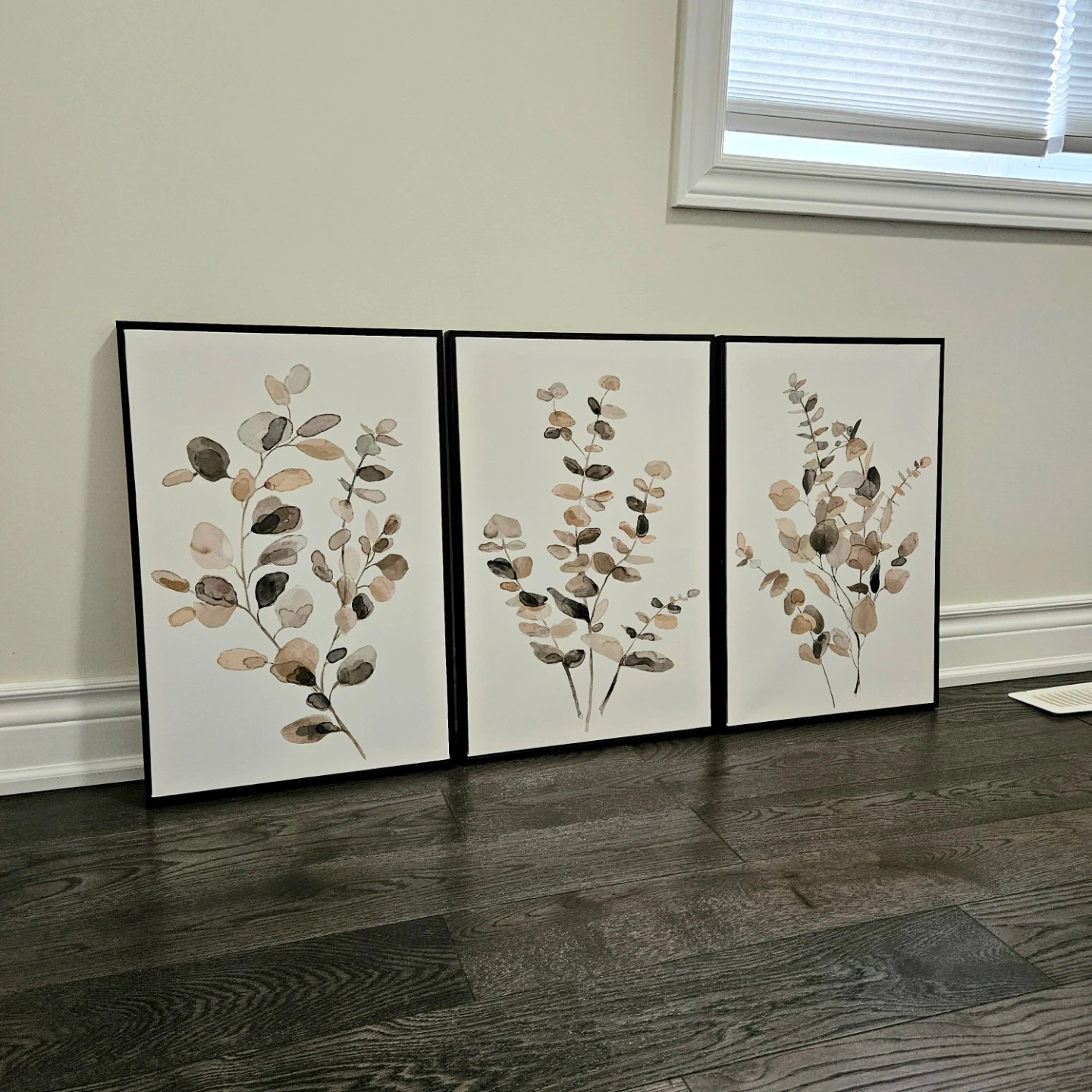 This set includes three framed prints featuring delicate watercolour eucalyptus branches. The neutral tones and botanical design complement various decor styles. They're ready to hang and bring a touch of nature indoors!