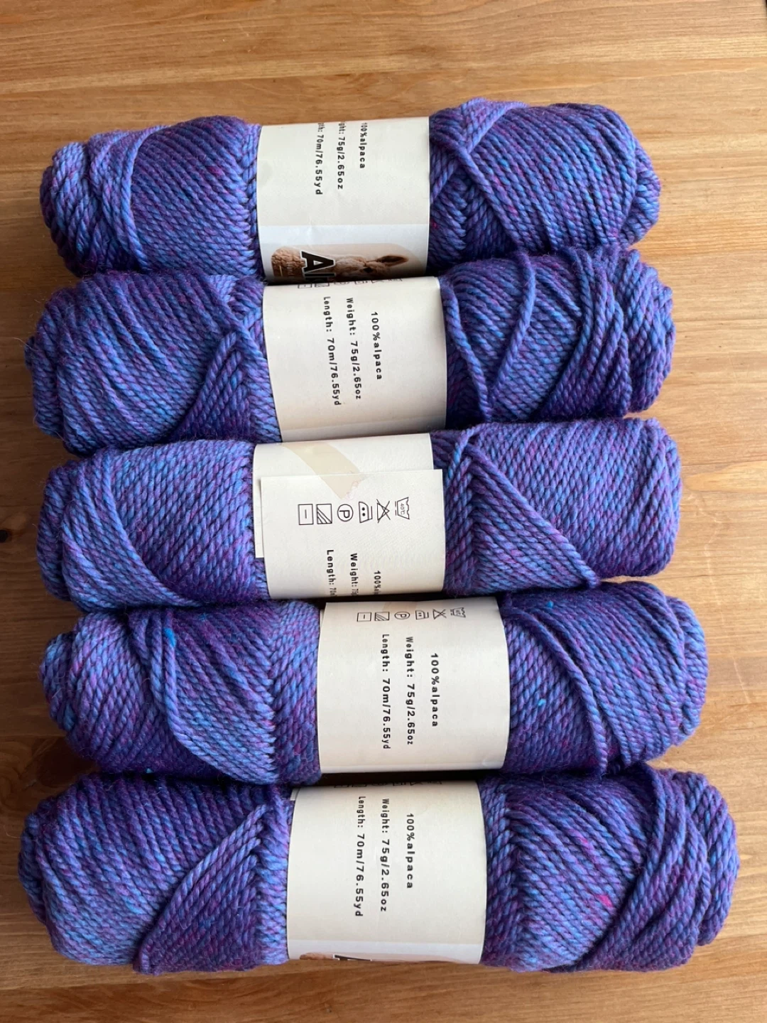 Five skeins of 100% alpaca yarn. Each skein weighs 75g/2.65oz with a length of 70m/76.55yd. This yarn comes in a lovely purple mix colour.