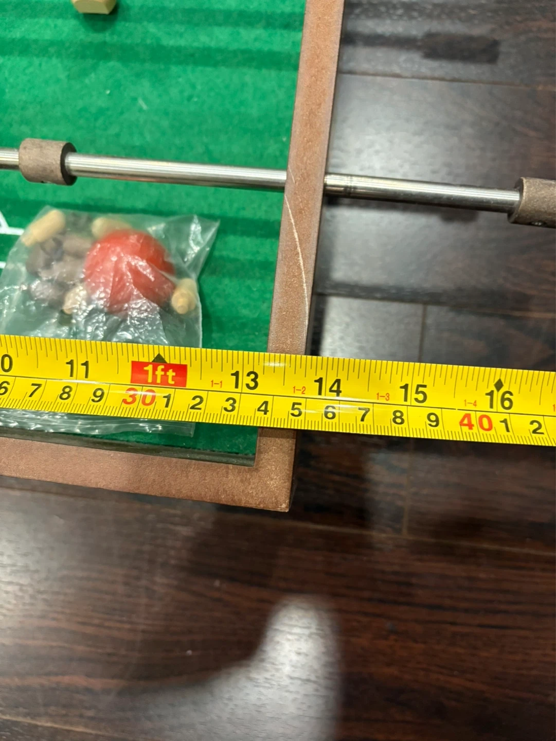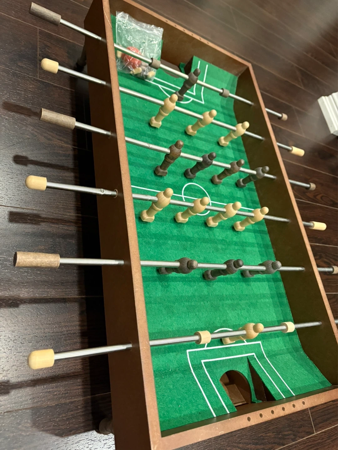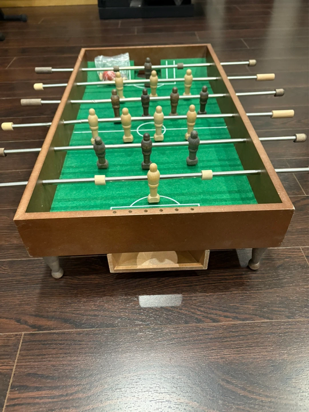 Compact tabletop foosball game with a wooden frame. Includes a set of playing pieces and soccer balls. It's about 2 feet long. Fun for game nights!