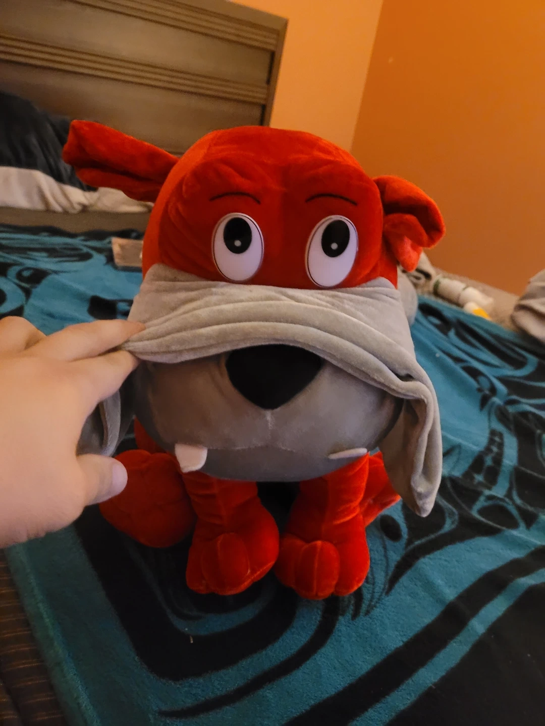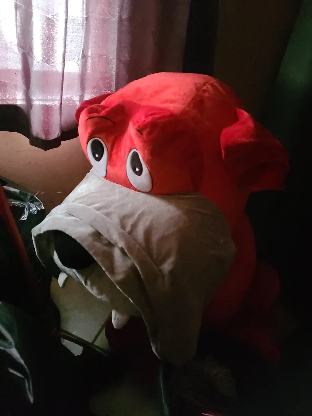This is a large, red plush stuffed toy. It has a soft texture and is designed with large cartoon eyes. Its material is polyester filling.