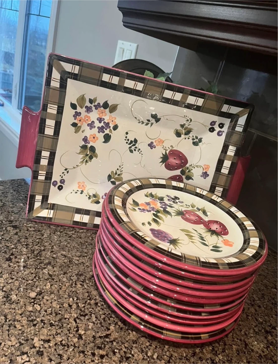 Set of ten dessert plates and a large rectangular serving platter. Features a charming strawberry and floral design with a pink and plaid border. This collection is perfect for serving desserts or appetizers at your next gathering!