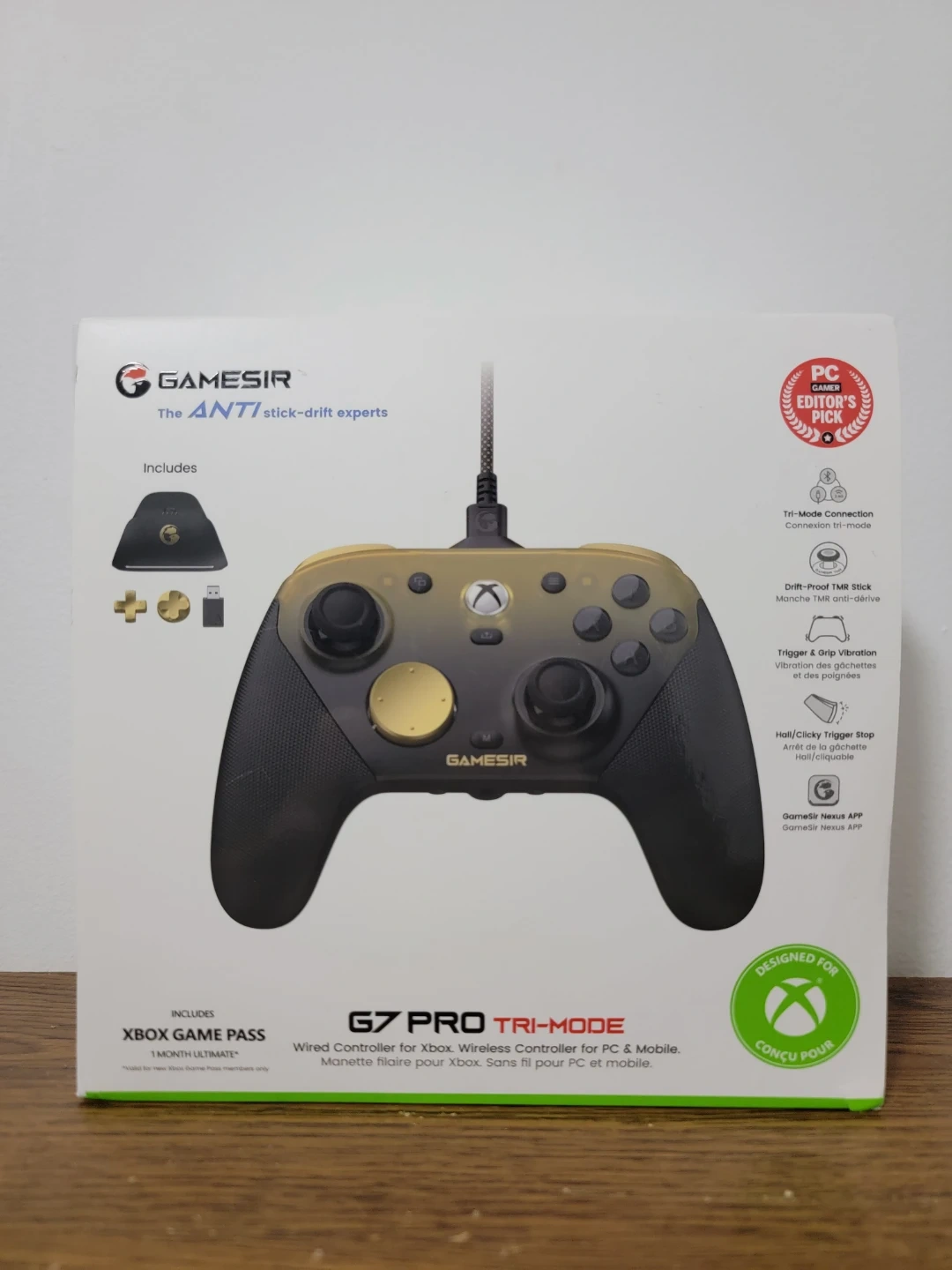 Gamesir g7 pro tri mode (wired/wireless/bluetooth) controller. Box includes controller, manual, charging dock, wireless dongle, cable, 2 other dpad options and unused xbox gamepass ultimate code.