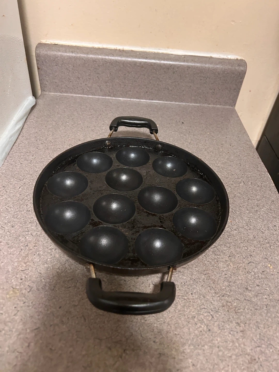 This is a 12-cup non-stick paniyappam maker. It has a durable construction with easy-grip handles. Perfect for making those delicious little snack balls!